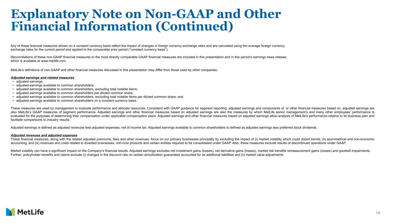 13 Explanatory Note on Non-GAAP and Other Financial Information Any references in this presentation (except in this Explanatory Note on Non-GAAP Financial Information and Reconciliations) to: Should be read as, respectively: (i) net income (loss); (i) net income (loss) available to MetLife, Inc.’s common shareholders; (ii) net income (loss) per share; (ii) net income (loss) available to MetLife, Inc.’s common shareholders per diluted common share; (iii) adjusted earnings; and (iii) adjusted earnings available to common shareholders; and (iv) adjusted earnings per share. (iv) adjusted earnings available to common shareholders per diluted common share. In this presentation, MetLife presents certain measures of its performance on a consolidated and segment basis that are not calculated in accordance with accounting principles generally accepted in the United States of America (GAAP). MetLife believes that these non-GAAP financial measures enhance the understanding for MetLife and its investors of MetLife's performance by highlighting the results of operations and the underlying profitability drivers of the business. Segment-specific financial measures are calculated using only the portion of consolidated results attributable to that specific segment. The following non-GAAP financial measures should not be viewed as substitutes for the most directly comparable financial measures calculated in accordance with GAAP: Non-GAAP financial measures: Comparable GAAP financial measures: (i) adjusted premiums, fees and other revenues; (i) premiums, fees and other revenues; (ii) adjusted premiums, fees and other revenues, excluding PRT; (ii) premiums, fees and other revenues; (iii) adjusted capitalization of deferred policy acquisition costs (DAC); (iii) capitalization of DAC; (iv) adjusted earnings available to common shareholders; (iv) net income (loss) available to MetLife, Inc.’s common shareholders; (v) adjusted earnings available to common shareholders, excluding total notable items; (v) net income (loss) available to MetLife, Inc.’s common shareholders; (vi) adjusted earnings available to common shareholders per diluted common share; (vi) net income (loss) available to MetLife, Inc.’s common shareholders per diluted common share; (vii) adjusted earnings available to common shareholders, excluding total notable items, per diluted common share; (vii) net income (loss) available to MetLife, Inc.’s common shareholders per diluted common share; (viii) adjusted other expenses; (viii) other expenses; (ix) adjusted other expenses, net of adjusted capitalization of DAC; (ix) other expenses, net of capitalization of DAC; (x) adjusted other expenses, net of adjusted capitalization of DAC, excluding total notable items related to adjusted other expenses; (x) other expenses, net of capitalization of DAC; (xi) adjusted expense ratio; (xi) expense ratio; (xii) adjusted expense ratio, excluding total notable items related to adjusted other expenses and PRT; (xii) expense ratio; (xiii) direct expenses; (xiii) other expenses; (xiv) direct expenses, excluding total notable items related to direct expenses; (xiv) other expenses; (xv) direct expense ratio; (xv) expense ratio; (xvi) direct expense ratio, excluding total notable items related to direct expenses and PRT; and (xvi) expense ratio; and (xvii) free cash flows of all holding companies. (xvii) MeLife, Inc. (parent company) net cash provided by (used in) operating activities.