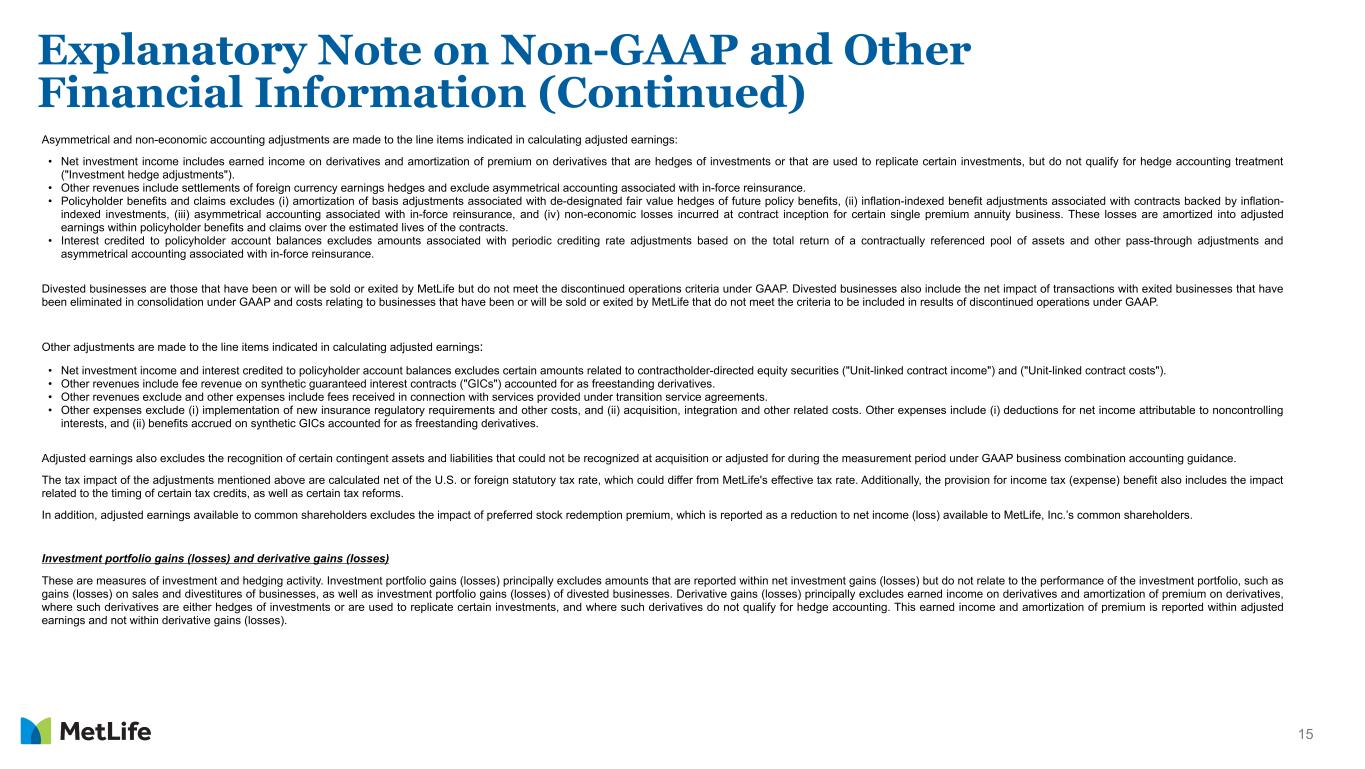 14 MetLife’s definitions of non-GAAP and other financial measures discussed in this presentation may differ from those used by other companies: Adjusted earnings and related measures • adjusted earnings; • adjusted earnings available to common shareholders; • adjusted earnings available to common shareholders, excluding total notable items; • adjusted earnings available to common shareholders per diluted common share; • adjusted earnings available to common shareholders, excluding total notable items per diluted common share; and • adjusted earnings available to common shareholders on a constant currency basis. These measures are used by management to evaluate performance and allocate resources. Consistent with GAAP guidance for segment reporting, adjusted earnings and components of, or other financial measures based on, adjusted earnings are also MetLife’s GAAP measures of segment performance. Adjusted earnings and other financial measures based on adjusted earnings are also the measures by which MetLife senior management’s and many other employees’ performance is evaluated for the purposes of determining their compensation under applicable compensation plans. Adjusted earnings and other financial measures based on adjusted earnings allow analysis of MetLife's performance relative to its business plan and facilitate comparisons to industry results. Adjusted earnings is defined as adjusted revenues less adjusted expenses, net of income tax. Adjusted earnings available to common shareholders is defined as adjusted earnings less preferred stock dividends. Adjusted revenues and adjusted expenses These financial measures, along with the related adjusted premiums, fees and other revenues, focus on our primary businesses principally by excluding the impact of (i) market volatility which could distort trends, (ii) asymmetrical and non-economic accounting, and (iii) revenues and costs related to divested businesses, non-core products and certain entities required to be consolidated under GAAP. Also, these measures exclude results of discontinued operations under GAAP. Market volatility can have a significant impact on the Company’s financial results. Adjusted earnings excludes net investment gains (losses), net derivative gains (losses), market risk benefits remeasurement gains (losses) and goodwill impairments. Further, policyholder benefits and claims exclude (i) changes in the discount rate on certain annuitization guarantees accounted for as additional liabilities and (ii) market value adjustments. Explanatory Note on Non-GAAP and Other Financial Information (Continued) Any of these financial measures shown on a constant currency basis reflect the impact of changes in foreign currency exchange rates and are calculated using the average foreign currency exchange rates for the current period and applied to the comparable prior period (“constant currency basis”). Reconciliations of these non-GAAP financial measures to the most directly comparable GAAP financial measures are included in this presentation and in this period’s earnings news release, which is available at www.metlife.com.