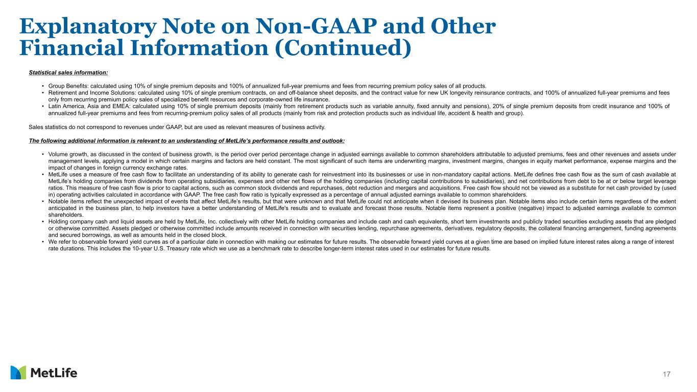 16 Explanatory Note on Non-GAAP and Other Financial Information (Continued) Return on equity and related measures • Total MetLife, Inc.’s common stockholders’ equity, excluding AOCI other than FCTA: total MetLife, Inc.’s common stockholders’ equity, excluding the net unrealized investment gains (losses), future policy benefits discount rate remeasurement gains (losses), market risk benefits instrument-specific credit risk remeasurement gains (losses), defined benefit plans adjustment components of AOCI, net of income tax. • Total MetLife, Inc.’s common stockholders’ equity, excluding total notable items (excludes AOCI other than FCTA): total MetLife, Inc.’s common stockholders’ equity, excluding the net unrealized investment gains (losses), future policy benefits discount rate remeasurement gains (losses), market risk benefits instrument-specific credit risk remeasurement gains (losses), defined benefit plans adjustment components of AOCI, and total notable items, net of income tax. • Return on MetLife, Inc.’s common stockholders’ equity: net income (loss) available to MetLife, Inc.’s common shareholders divided by MetLife, Inc.'s average common stockholders’ equity. • Adjusted return on MetLife, Inc.’s common stockholders’ equity: adjusted earnings available to common shareholders divided by MetLife, Inc.'s average common stockholders’ equity. • Adjusted return on MetLife, Inc.’s common stockholders’ equity, excluding AOCI other than FCTA: adjusted earnings available to common shareholders divided by MetLife, Inc.'s average common stockholders’ equity, excluding AOCI other than FCTA. • Adjusted return on MetLife, Inc.’s common stockholders’ equity, excluding total notable items (excludes AOCI other than FCTA): adjusted earnings available to common shareholders, excluding total notable items, divided by MetLife, Inc.'s average common stockholders’ equity, excluding total notable items (excludes AOCI other than FCTA). The above measures represent a level of equity consistent with the view that, in the ordinary course of business, we do not plan to sell most investments for the sole purpose of realizing gains or losses. Expense ratio, direct expense ratio, adjusted expense ratio and related measures • Expense ratio: other expenses, net of capitalization of DAC, divided by premiums, fees and other revenues. • Direct expense ratio: adjusted direct expenses, divided by adjusted premiums, fees and other revenues. Direct expenses are comprised of employee-related costs, third-party staffing costs, and general and administrative expenses. • Direct expense ratio, excluding total notable items related to direct expenses and PRT: adjusted direct expenses, excluding total notable items related to direct expenses, divided by adjusted premiums, fees and other revenues, excluding PRT. • Adjusted expense ratio: adjusted other expenses, net of adjusted capitalization of DAC, divided by adjusted premiums, fees and other revenues. • Adjusted expense ratio, excluding total notable items related to adjusted other expenses and PRT: adjusted other expenses, net of adjusted capitalization of DAC, excluding total notable items related to adjusted other expenses, divided by adjusted premiums, fees and other revenues, excluding PRT. General Account (GA) assets under management (GA AUM) GA AUM is used by MetLife to describe assets in its GA investment portfolio. GA AUM is stated at estimated fair value and is comprised of GA total investments, the portion of the GA investment portfolio classified within assets held-for-sale, and cash and cash equivalents, excluding policy loans, contractholder-directed equity securities, fair value option securities, mortgage loans originated for third parties and certain other invested assets. Mortgage loans, net of mortgage loans originated for third parties (“net mortgage loans”) (including commercial (“net commercial mortgage loans”), agricultural ("net agricultural mortgage loans") and residential mortgage loans) and real estate equity (including real estate and real estate joint ventures) included in GA AUM (at net asset value, net of deduction for encumbering debt) have been adjusted from carrying value to estimated fair value. Classification of GA AUM by sector is based on the nature and characteristics of the underlying investments which can vary from how they are classified under GAAP. Accordingly, the underlying investments within certain real estate and real estate joint ventures that are primarily net commercial mortgage loans (at net asset value, net of deduction for encumbering debt) have been reclassified to exclude them from real estate equity and include them as net commercial mortgage loans. Asia GA AUM and related measures Asia GA AUM is used by MetLife to describe assets in its Asia GA investment portfolio. Asia GA AUM is stated at estimated fair value and is comprised of Asia GA total investments, the portion of the Asia GA investment portfolio classified within assets held-for-sale and cash and cash equivalents, excluding policy loans, contractholder-directed equity securities, fair value option securities, mortgage loans originated for third parties and certain other invested assets. Mortgage loans, net of mortgage loans originated for third parties ("net mortgage loans") (including commercial ("net commercial mortgage loans"), agricultural ("net agricultural mortgage loans") and residential mortgage loans) and real estate equity (including real estate and real estate joint ventures) included in Asia GA AUM (at net asset value, net of deduction for encumbering debt) have been adjusted from carrying value to estimated fair value. At the segment level, intersegment balances (intercompany activity, primarily related to investments in subsidiaries, that eliminate at the MetLife consolidated level) are excluded from Asia GA AUM. Asia GA AUM (at amortized cost) excludes the following adjustmen