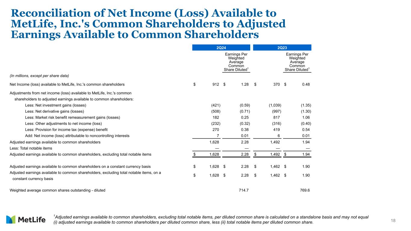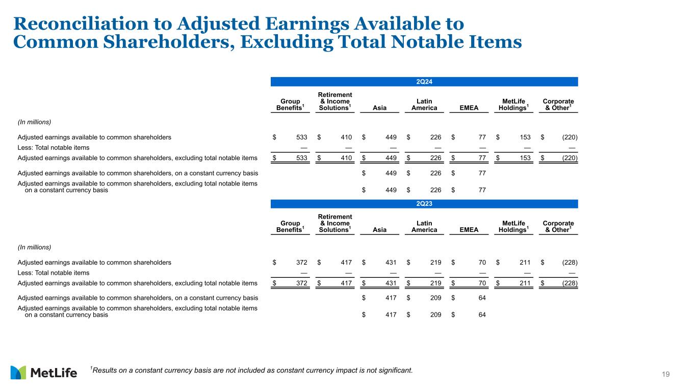 18 Reconciliation of Net Income (Loss) Available to MetLife, Inc.'s Common Shareholders to Adjusted Earnings Available to Common Shareholders 2Q24 2Q23 Earnings Per Weighted Average Common Share Diluted1 Earnings Per Weighted Average Common Share Diluted1 (In millions, except per share data) Net Income (loss) available to MetLife, Inc.'s common shareholders $ 912 $ 1.28 $ 370 $ 0.48 Adjustments from net income (loss) available to MetLife, Inc.'s common shareholders to adjusted earnings available to common shareholders: Less: Net investment gains (losses) (421) (0.59) (1,039) (1.35) Less: Net derivative gains (losses) (508) (0.71) (997) (1.30) Less: Market risk benefit remeasurement gains (losses) 182 0.25 817 1.06 Less: Other adjustments to net income (loss) (232) (0.32) (316) (0.40) Less: Provision for income tax (expense) benefit 270 0.38 419 0.54 Add: Net income (loss) attributable to noncontrolling interests 7 0.01 6 0.01 Adjusted earnings available to common shareholders 1,628 2.28 1,492 1.94 Less: Total notable items — — — — Adjusted earnings available to common shareholders, excluding total notable items $ 1,628 2.28 $ 1,492 $ 1.94 Adjusted earnings available to common shareholders on a constant currency basis $ 1,628 $ 2.28 $ 1,462 $ 1.90 Adjusted earnings available to common shareholders, excluding total notable items, on a $ 1,628 $ 2.28 $ 1,462 $ 1.90 constant currency basis Weighted average common shares outstanding - diluted 714.7 769.6 1Adjusted earnings available to common shareholders, excluding total notable items, per diluted common share is calculated on a standalone basis and may not equal (i) adjusted earnings available to common shareholders per diluted common share, less (ii) total notable items per diluted common share.