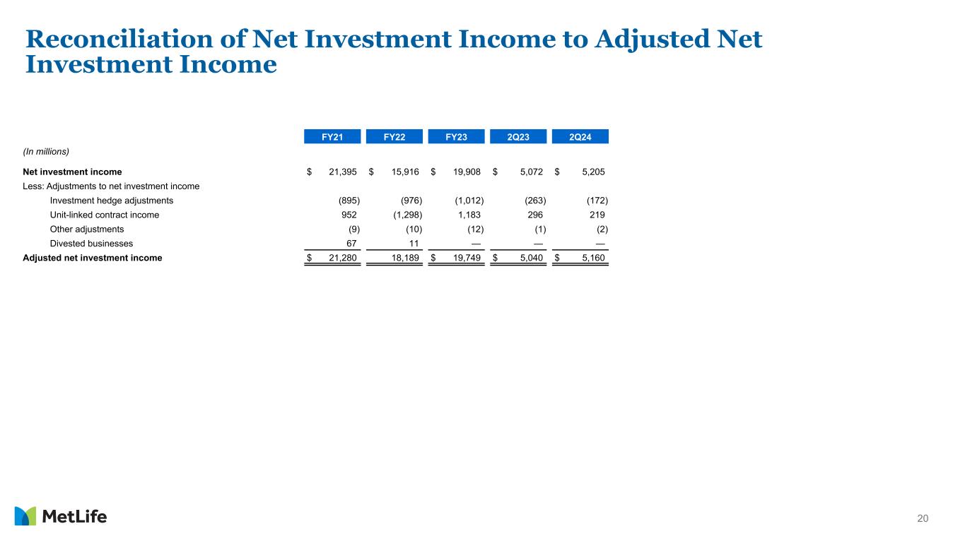 19 Reconciliation to Adjusted Earnings Available to Common Shareholders, Excluding Total Notable Items 2Q24 Group Benefits1 Retirement & Income Solutions1 Asia Latin America EMEA MetLife Holdings1 Corporate & Other1 (In millions) Adjusted earnings available to common shareholders $ 533 $ 410 $ 449 $ 226 $ 77 $ 153 $ (220) Less: Total notable items — — — — — — — Adjusted earnings available to common shareholders, excluding total notable items $ 533 $ 410 $ 449 $ 226 $ 77 $ 153 $ (220) Adjusted earnings available to common shareholders, on a constant currency basis $ 449 $ 226 $ 77 Adjusted earnings available to common shareholders, excluding total notable items on a constant currency basis $ 449 $ 226 $ 77 2Q23 Group Benefits1 Retirement & Income Solutions1 Asia Latin America EMEA MetLife Holdings1 Corporate & Other1 (In millions) Adjusted earnings available to common shareholders $ 372 $ 417 $ 431 $ 219 $ 70 $ 211 $ (228) Less: Total notable items — — — — — — — Adjusted earnings available to common shareholders, excluding total notable items $ 372 $ 417 $ 431 $ 219 $ 70 $ 211 $ (228) Adjusted earnings available to common shareholders, on a constant currency basis $ 417 $ 209 $ 64 Adjusted earnings available to common shareholders, excluding total notable items on a constant currency basis $ 417 $ 209 $ 64 1Results on a constant currency basis are not included as constant currency impact is not significant.