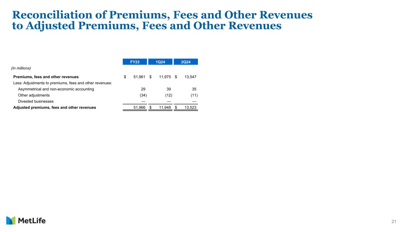 20 Reconciliation of Net Investment Income to Adjusted Net Investment Income FY21 FY22 FY23 2Q23 2Q24 (In millions) Net investment income $ 21,395 $ 15,916 $ 19,908 $ 5,072 $ 5,205 Less: Adjustments to net investment income Investment hedge adjustments (895) (976) (1,012) (263) (172) Unit-linked contract income 952 (1,298) 1,183 296 219 Other adjustments (9) (10) (12) (1) (2) Divested businesses 67 11 — — — Adjusted net investment income $ 21,280 18,189 $ 19,749 $ 5,040 $ 5,160