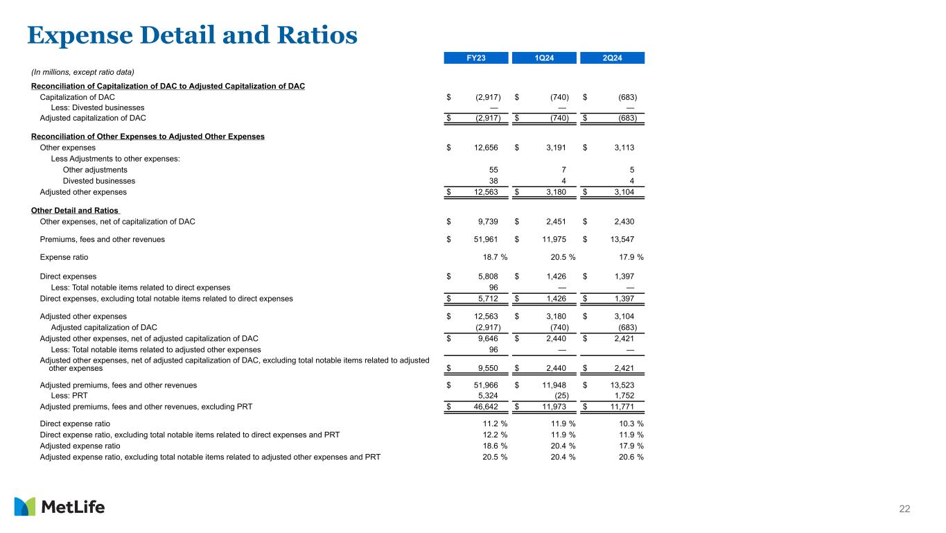 21 Reconciliation of Premiums, Fees and Other Revenues to Adjusted Premiums, Fees and Other Revenues FY23 1Q24 2Q24 (In millions) Premiums, fees and other revenues $ 51,961 $ 11,975 $ 13,547 Less: Adjustments to premiums, fees and other revenues: Asymmetrical and non-economic accounting 29 39 35 Other adjustments (34) (12) (11) Divested businesses — — — Adjusted premiums, fees and other revenues 51,966 $ 11,948 $ 13,523
