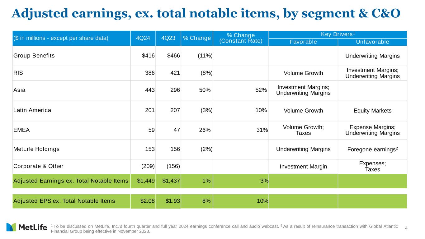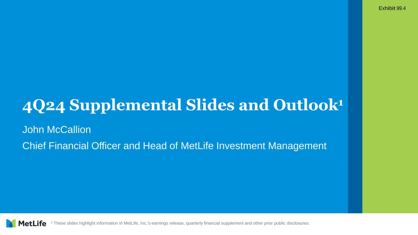 4Q24 Supplemental Slides and Outlook1 John McCallion Chief Financial Officer and Head of MetLife Investment Management Exhibit 99.4 1 These slides highlight information in MetLife, Inc.'s earnings release, quarterly financial supplement and other prior public disclosures.