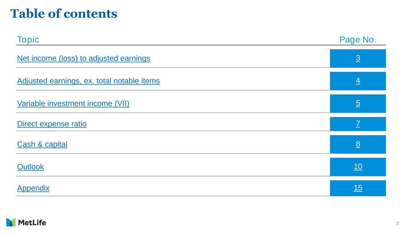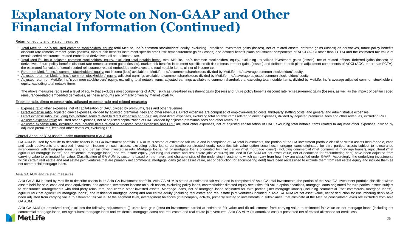 24 Explanatory Note on Non-GAAP and Other Financial Information (Continued) Asymmetrical and non-economic accounting adjustments are made to the line items indicated in calculating adjusted earnings: • Net investment income includes earned income on derivatives and amortization of premium on derivatives that are hedges of investments or that are used to replicate certain investments, but do not qualify for hedge accounting treatment ("Investment hedge adjustments"). • Other revenues include settlements of foreign currency earnings hedges and exclude asymmetrical accounting associated with in-force reinsurance. • Policyholder benefits and claims excludes (i) amortization of basis adjustments associated with de-designated fair value hedges of future policy benefits, (ii) inflation-indexed benefit adjustments associated with contracts backed by inflation- indexed investments, (iii) asymmetrical accounting associated with in-force reinsurance, and (iv) non-economic losses incurred at contract inception for certain single premium annuity business. These losses are amortized into adjusted earnings within policyholder benefits and claims over the estimated lives of the contracts. • Policyholder liability remeasurement gains (losses) excludes asymmetrical accounting associated with in-force reinsurance. • Interest credited to policyholder account balances excludes amounts associated with periodic crediting rate adjustments based on the total return of a contractually referenced pool of assets and other pass-through adjustments and asymmetrical accounting associated with in-force reinsurance. Divested businesses are those that have been or will be sold or exited by MetLife but do not meet the discontinued operations criteria under GAAP. Divested businesses also include the net impact of transactions with exited businesses that have been eliminated in consolidation under GAAP and costs relating to businesses that have been or will be sold or exited by MetLife that do not meet the criteria to be included in results of discontinued operations under GAAP. Other adjustments are made in calculating adjusted earnings: • Net investment income and interest credited to policyholder account balances excludes certain amounts related to contractholder-directed equity securities ("Unit-linked contract income") and ("Unit-linked contract costs"). Net investment income excludes returns on invested assets (including cash and cash equivalents) subject to ceded reinsurance arrangements with third parties ("Reinsurance adjustments"). • Other revenues include fee revenue on synthetic guaranteed interest contracts ("GICs") accounted for as freestanding derivatives. • Other revenues exclude and other expenses include fees received in connection with services provided under transition service agreements. • Other expenses exclude (i) Reinsurance adjustments, (ii) implementation of new insurance regulatory requirements and other costs, and (iii) acquisition, integration and other related costs. Other expenses include (i) deductions for net income attributable to noncontrolling interests, and (ii) benefits accrued on synthetic GICs accounted for as freestanding derivatives. Adjusted earnings also excludes the recognition of certain contingent assets and liabilities that could not be recognized at acquisition or adjusted for during the measurement period under GAAP business combination accounting guidance. The tax impact of the adjustments mentioned above are calculated net of the U.S. or foreign statutory tax rate, which could differ from MetLife's effective tax rate. Additionally, the provision for income tax (expense) benefit also includes the impact related to the timing of certain tax credits, as well as certain tax reforms. In addition, adjusted earnings available to common shareholders excludes the impact of preferred stock redemption premium, which is reported as a reduction to net income (loss) available to MetLife, Inc.’s common shareholders. Investment portfolio gains (losses) and derivative gains (losses) These are measures of investment and hedging activity. Investment portfolio gains (losses) principally excludes amounts that are reported within net investment gains (losses) but do not relate to the performance of the investment portfolio, such as gains (losses) on sales and divestitures of businesses, as well as investment portfolio gains (losses) of divested businesses. Derivative gains (losses) principally excludes earned income on derivatives and amortization of premium on derivatives, where such derivatives are either hedges of investments or are used to replicate certain investments, and where such derivatives do not qualify for hedge accounting. This earned income and amortization of premium is reported within adjusted earnings and not within derivative gains (losses).