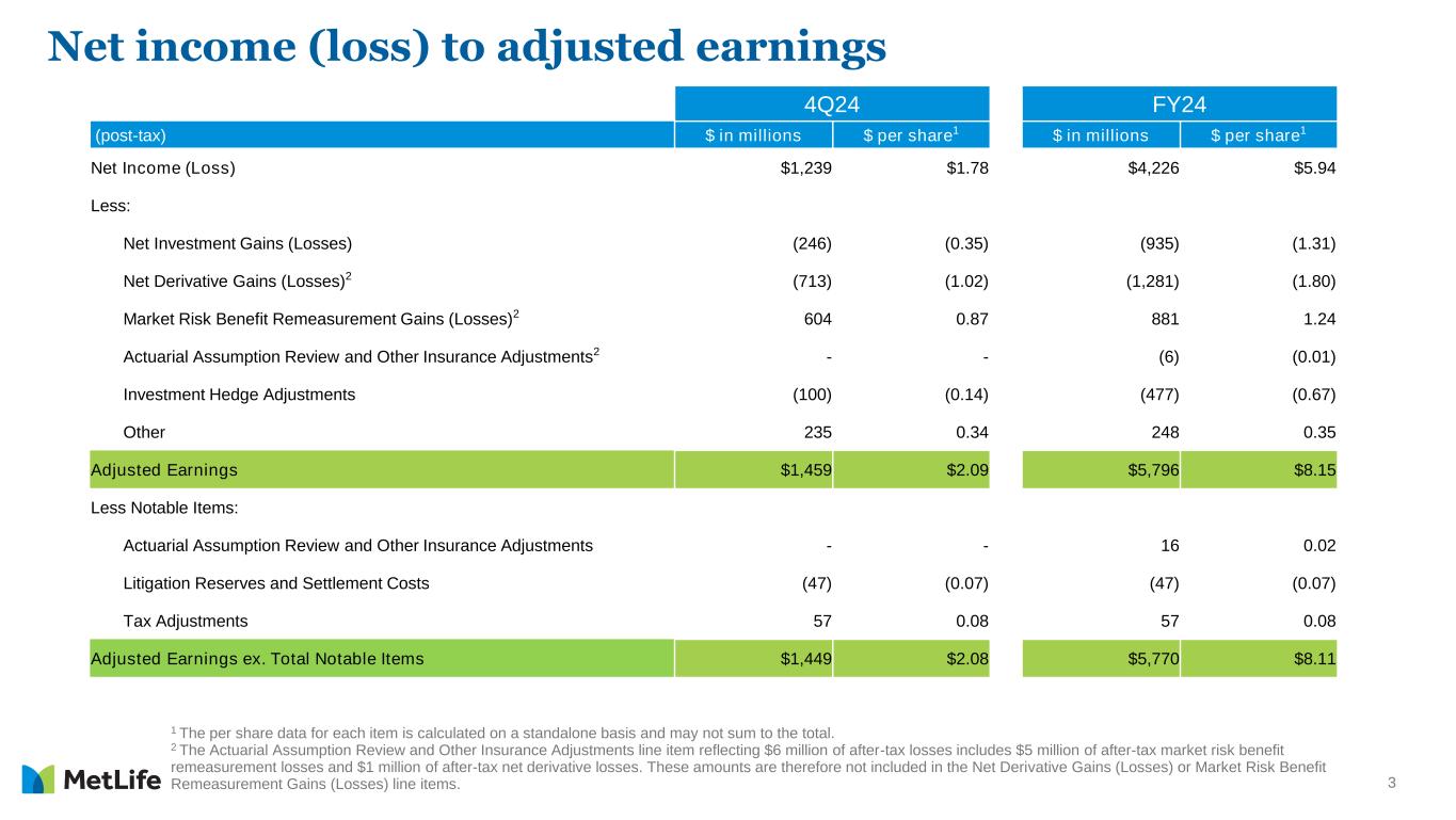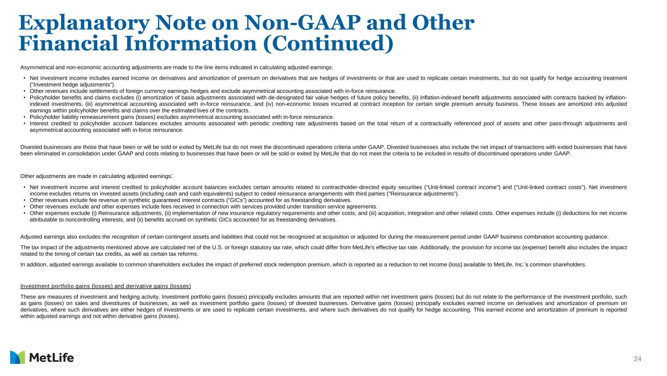 23 MetLife’s definitions of non-GAAP and other financial measures discussed in this presentation may differ from those used by other companies: Adjusted earnings and related measures • adjusted earnings; • adjusted earnings available to common shareholders; • adjusted earnings available to common shareholders, excluding total notable items; • adjusted earnings available to common shareholders per diluted common share; • adjusted earnings available to common shareholders, excluding total notable items per diluted common share; and • adjusted earnings available to common shareholders on a constant currency basis. Adjusted earnings is used by the MetLife's chief operating decision maker, its chief executive officer, to evaluate performance and allocate resources. Consistent with GAAP guidance for segment reporting, adjusted earnings is MetLife’s GAAP measure of segment performance. Adjusted earnings and related measures based on adjusted earnings are also the measures by which senior management’s and many other employees’ performance is evaluated for the purposes of determining their compensation under applicable compensation plans. Adjusted earnings and related measures based on adjusted earnings allow analysis of MetLife's performance relative to its business plan and facilitate comparisons to industry results. Adjusted earnings is defined as adjusted revenues less adjusted expenses, net of income tax. Adjusted earnings available to common shareholders is defined as adjusted earnings less preferred stock dividends. Adjusted earnings, along with the related adjusted revenues, adjusted expenses and adjusted premiums, fees and other revenues, focus on our primary businesses principally by excluding the impact of (i) market volatility which could distort trends, (ii) asymmetrical and non-economic accounting, (iii) revenues and costs related to divested businesses, and (iv) other adjustments. Also, adjusted earnings and related measures exclude results of discontinued operations under GAAP. Market volatility can have a significant impact on the MetLife's financial results. Adjusted earnings excludes net investment gains (losses), net derivative gains (losses), market risk benefits remeasurement gains (losses) and goodwill impairments. Further, net investment income excludes adjusted earnings adjustments relating to joint ventures accounted for under the equity method ("Joint venture adjustments"), and policyholder benefits and claims exclude (i) changes in the discount rate on certain annuitization guarantees accounted for as additional liabilities and (ii) market value adjustments. Explanatory Note on Non-GAAP and Other Financial Information (Continued) Reconciliations of these non-GAAP measures to the most directly comparable GAAP measures are not accessible on a forward-looking basis because we believe it is not possible without unreasonable effort to provide other than a range of net investment gains and losses and net derivative gains and losses, which can fluctuate significantly within or outside the range and from period to period and may have a material impact on net income. Any of these financial measures shown on a constant currency basis reflect the impact of changes in foreign currency exchange rates and are calculated using the average foreign currency exchange rates for the current period and applied to the comparable prior period (“constant currency basis”). Reconciliations of these non-GAAP financial measures to the most directly comparable GAAP financial measures are included in this presentation and in this period’s earnings news release, which is available at https://investor.metlife.com.