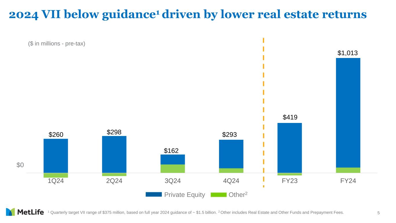 4 ($ in millions - except per share data) 4Q24 4Q23 % Change % Change (Constant Rate) Key Drivers1 Favorable Unfavorable Group Benefits $416 $466 (11%) Underwriting Margins RIS 386 421 (8%) Volume Growth Investment Margins; Underwriting Margins Asia 443 296 50% 52% Investment Margins; Underwriting Margins Latin America 201 207 (3%) 10% Volume Growth Equity Markets EMEA 59 47 26% 31% Volume Growth; Taxes Expense Margins; Underwriting Margins MetLife Holdings 153 156 (2%) Underwriting Margins Foregone earnings2 Corporate & Other (209) (156) Investment Margin Expenses; Taxes Adjusted Earnings ex. Total Notable Items $1,449 $1,437 1% 3% Adjusted EPS ex. Total Notable Items $2.08 $1.93 8% 10% Adjusted earnings, ex. total notable items, by segment & C&O 1 To be discussed on MetLife, Inc.’s fourth quarter and full year 2024 earnings conference call and audio webcast. 2 As a result of reinsurance transaction with Global Atlantic Financial Group being effective in November 2023.