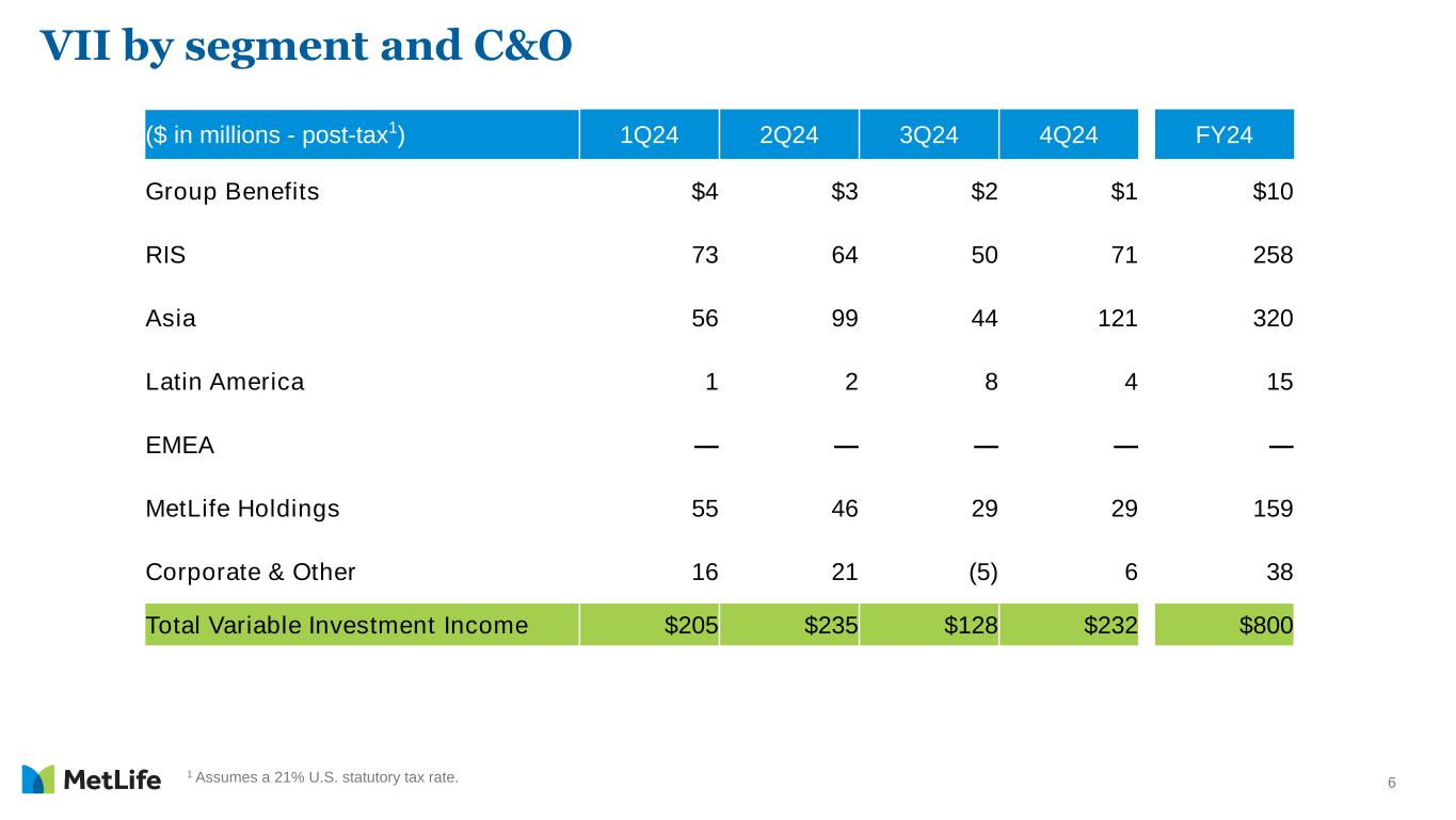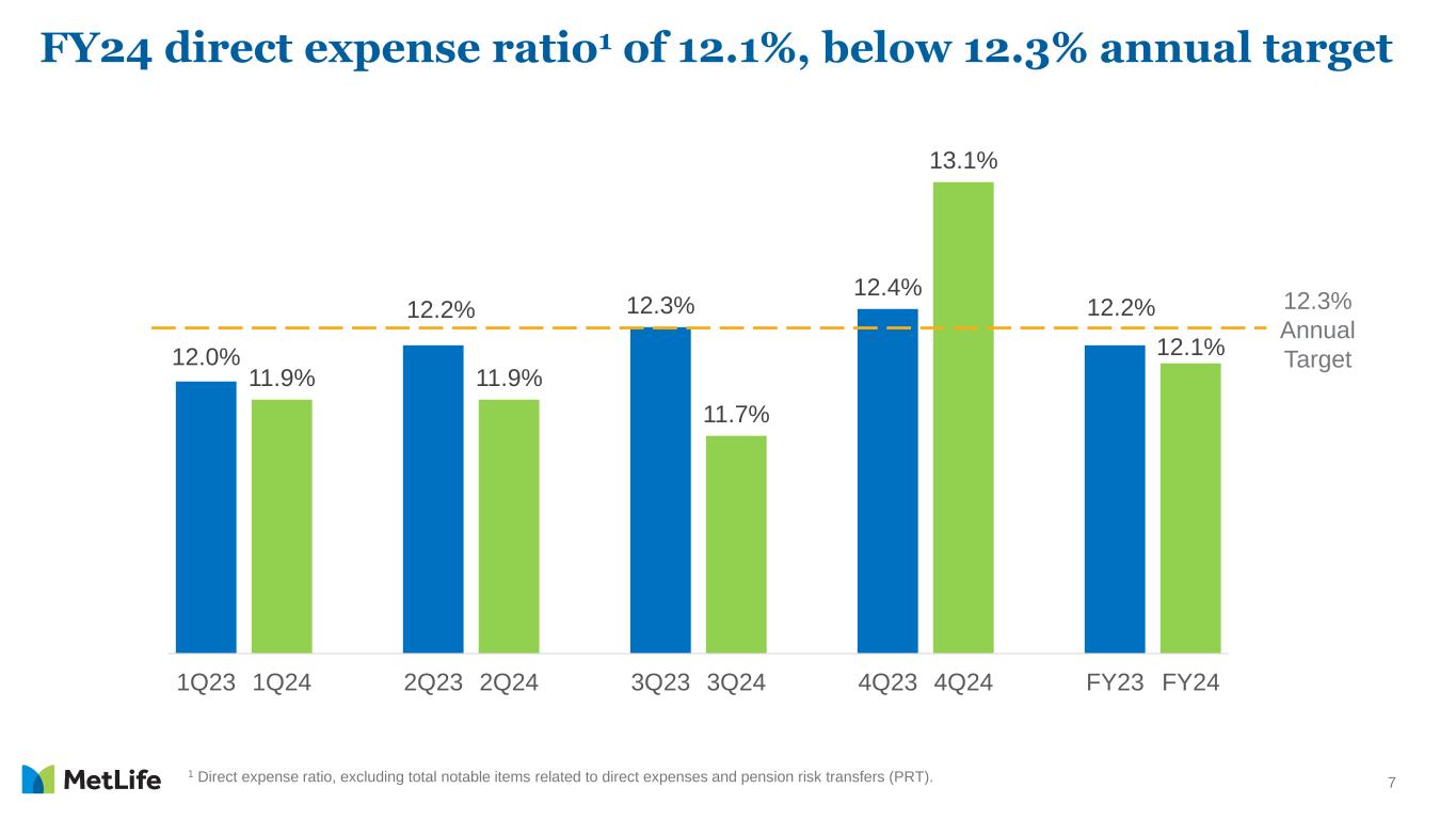 6 1 Assumes a 21% U.S. statutory tax rate. VII by segment and C&O ($ in millions - post-tax1) 1Q24 2Q24 3Q24 4Q24 FY24 Group Benefits $4 $3 $2 $1 $10 RIS 73 64 50 71 258 Asia 56 99 44 121 320 Latin America 1 2 8 4 15 EMEA — — — — — MetLife Holdings 55 46 29 29 159 Corporate & Other 16 21 (5) 6 38 Total Variable Investment Income $205 $235 $128 $232 $800