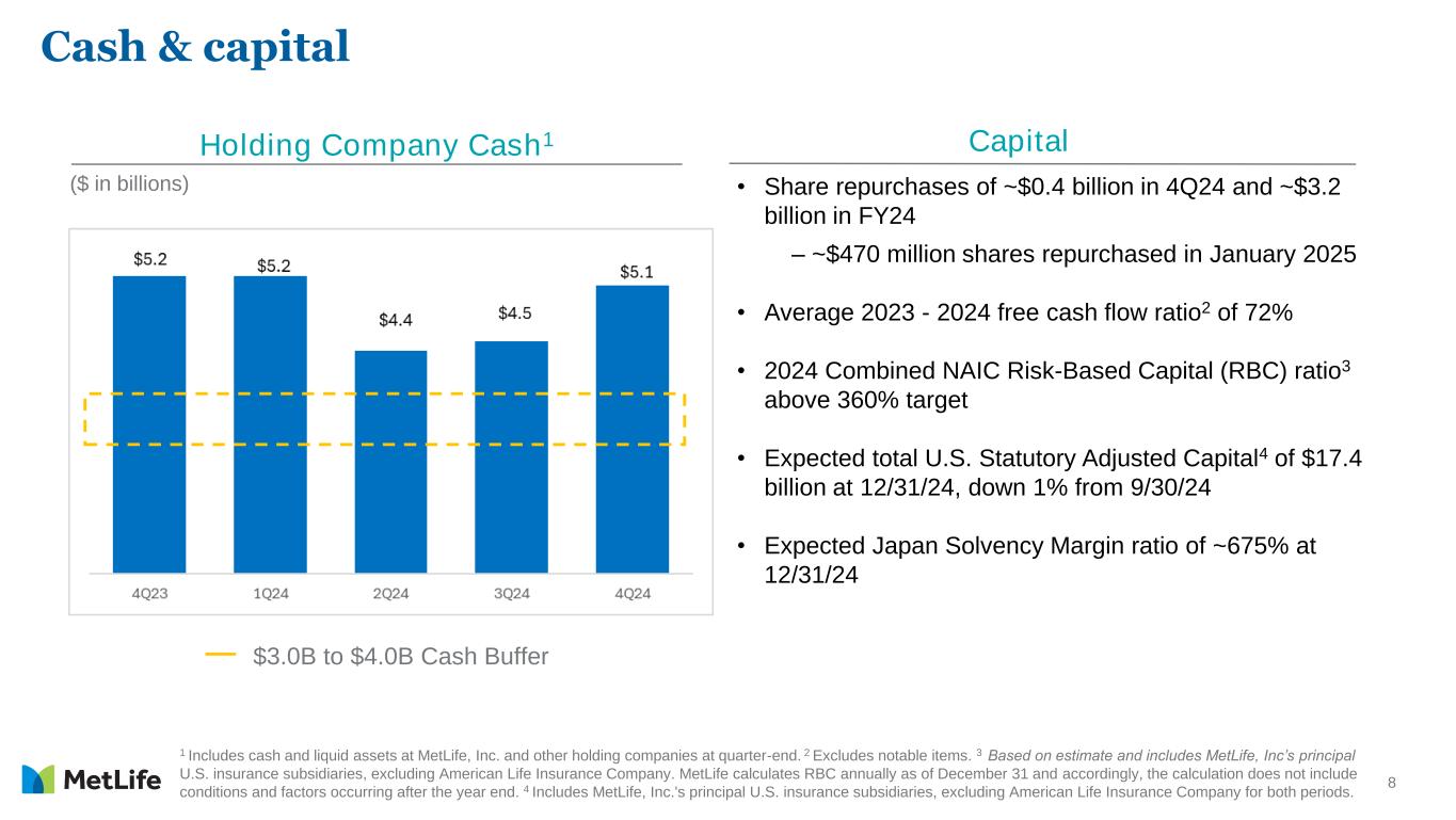 7 1 Direct expense ratio, excluding total notable items related to direct expenses and pension risk transfers (PRT). 12.3% Annual Target FY24 direct expense ratio1 of 12.1%, below 12.3% annual target 12.0% 11.9% 12.2% 11.9% 12.3% 11.7% 12.4% 13.1% 12.2% 12.1% 1Q23 1Q24 2Q23 2Q24 3Q23 3Q24 4Q23 4Q24 FY23 FY24