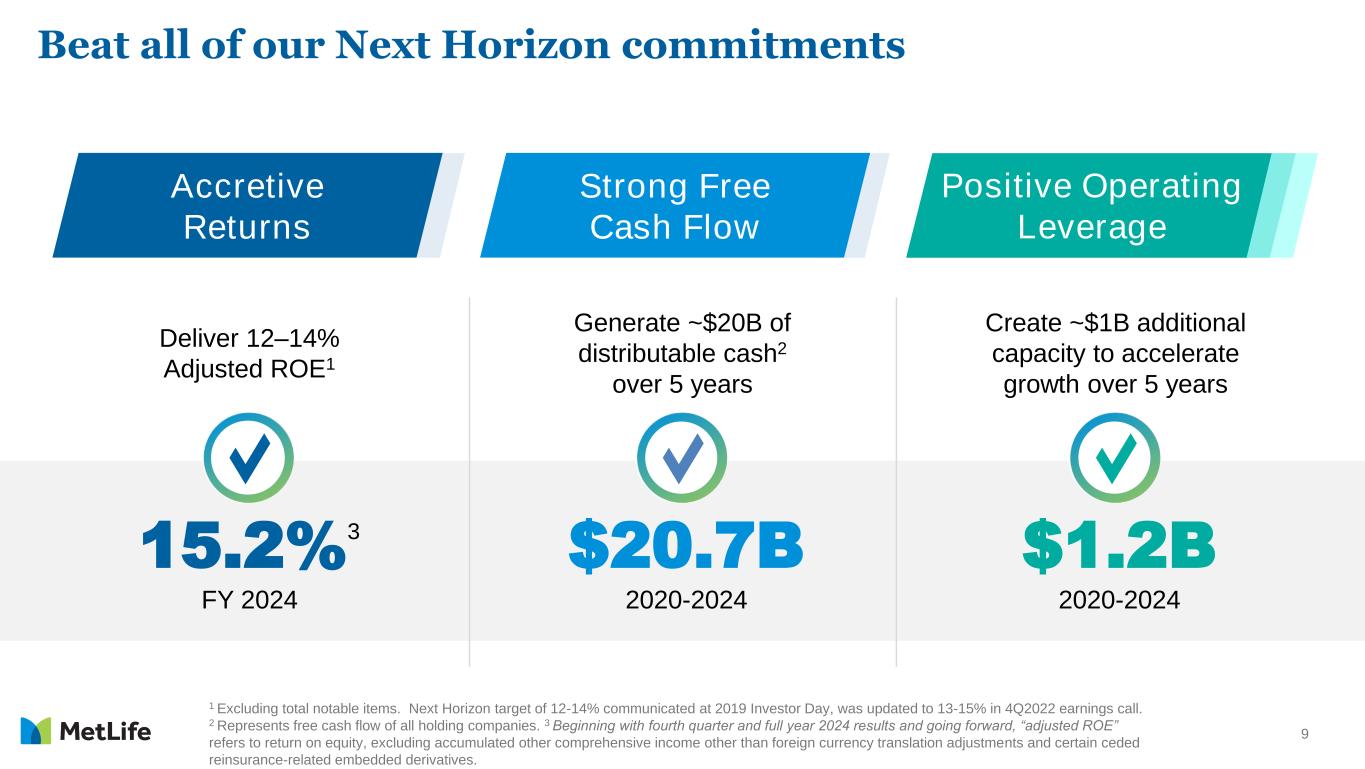 8 Holding Company Cash1 Cash & capital 1 Includes cash and liquid assets at MetLife, Inc. and other holding companies at quarter-end. 2 Excludes notable items. 3 Based on estimate and includes MetLife, Inc’s principal U.S. insurance subsidiaries, excluding American Life Insurance Company. MetLife calculates RBC annually as of December 31 and accordingly, the calculation does not include conditions and factors occurring after the year end. 4 Includes MetLife, Inc.'s principal U.S. insurance subsidiaries, excluding American Life Insurance Company for both periods. $3.0B to $4.0B Cash Buffer Capital ($ in billions) • Share repurchases of ~$0.4 billion in 4Q24 and ~$3.2 billion in FY24 – ~$470 million shares repurchased in January 2025 • Average 2023 - 2024 free cash flow ratio2 of 72% • 2024 Combined NAIC Risk-Based Capital (RBC) ratio3 above 360% target • Expected total U.S. Statutory Adjusted Capital4 of $17.4 billion at 12/31/24, down 1% from 9/30/24 • Expected Japan Solvency Margin ratio of ~675% at 12/31/24