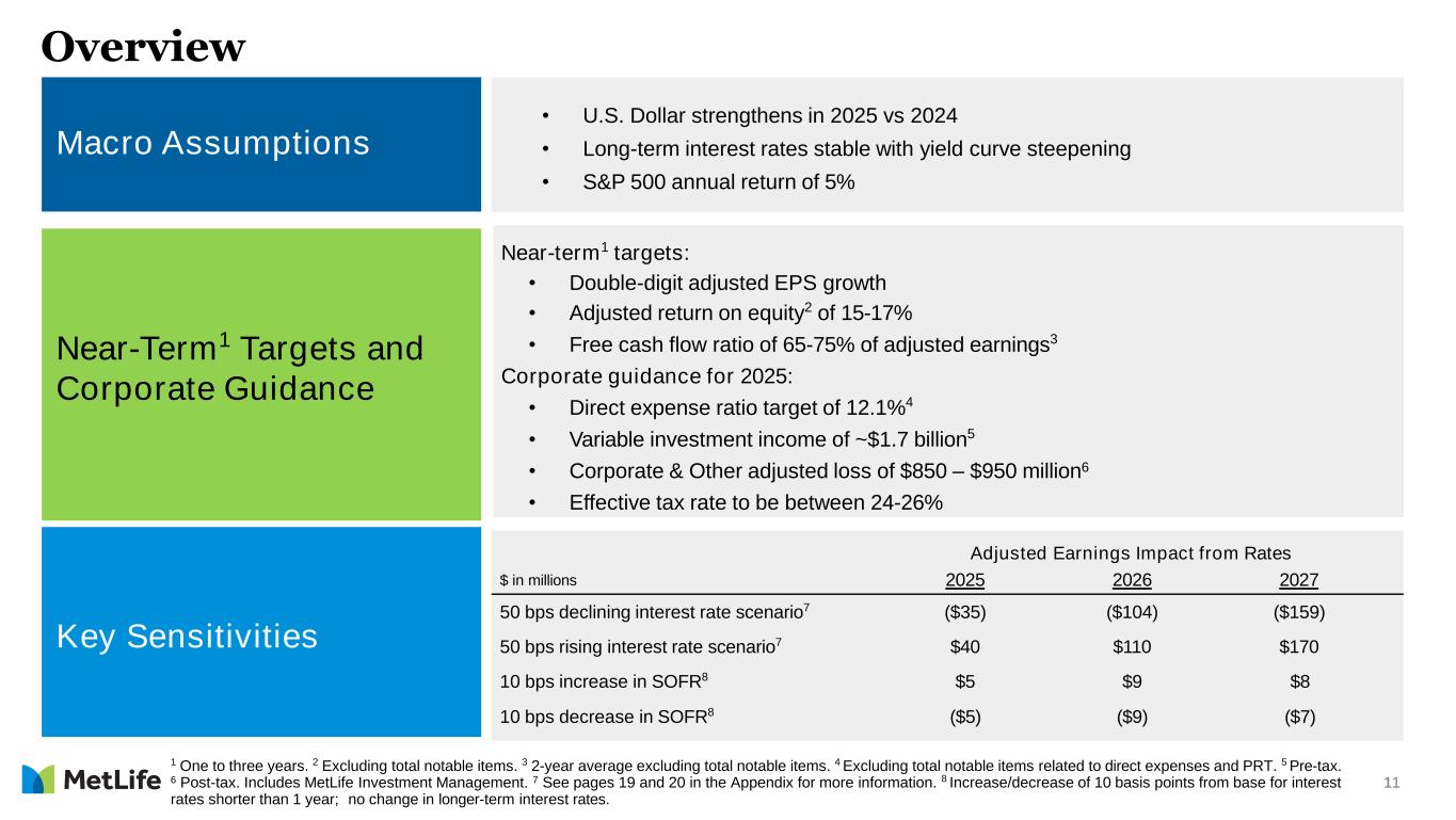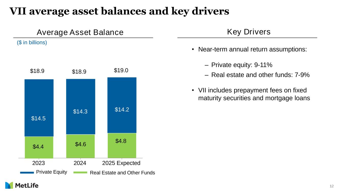 11 Overview 1 One to three years. 2 Excluding total notable items. 3 2-year average excluding total notable items. 4 Excluding total notable items related to direct expenses and PRT. 5 Pre-tax. 6 Post-tax. Includes MetLife Investment Management. 7 See pages 19 and 20 in the Appendix for more information. 8 Increase/decrease of 10 basis points from base for interest rates shorter than 1 year; no change in longer-term interest rates. • U.S. Dollar strengthens in 2025 vs 2024 • Long-term interest rates stable with yield curve steepening • S&P 500 annual return of 5% Near-term1 targets: • Double-digit adjusted EPS growth • Adjusted return on equity2 of 15-17% • Free cash flow ratio of 65-75% of adjusted earnings3 Corporate guidance for 2025: • Direct expense ratio target of 12.1%4 • Variable investment income of ~$1.7 billion5 • Corporate & Other adjusted loss of $850 – $950 million6 • Effective tax rate to be between 24-26% Adjusted Earnings Impact from Rates $ in millions 2025 2026 2027 50 bps declining interest rate scenario7 ($35) ($104) ($159) 50 bps rising interest rate scenario7 $40 $110 $170 10 bps increase in SOFR8 $5 $9 $8 10 bps decrease in SOFR8 ($5) ($9) ($7) Macro Assumptions Near-Term1 Targets and Corporate Guidance Key Sensitivities