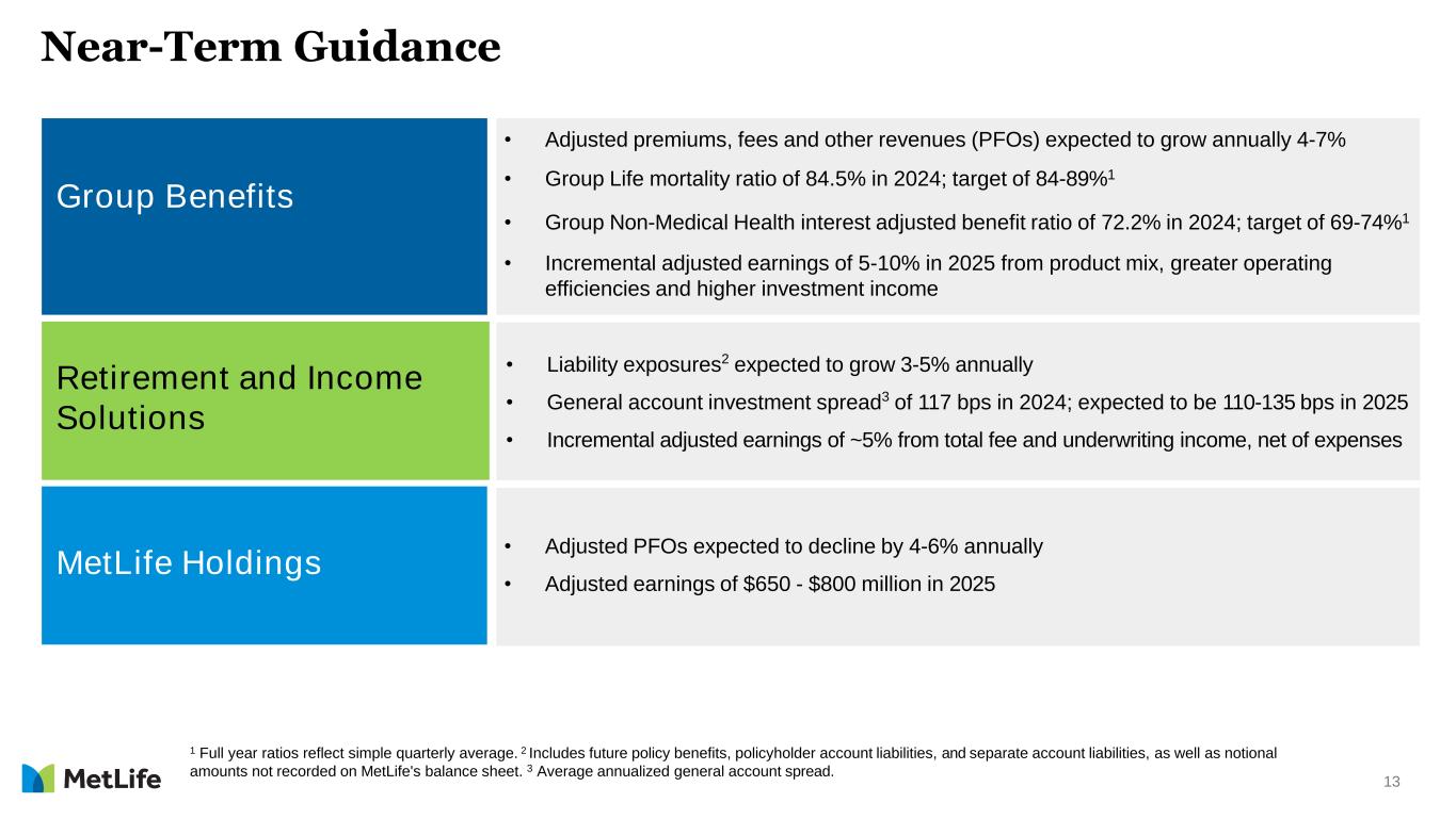 12 VII average asset balances and key drivers 2023 2024 ($ in billions) Private Equity 2025 Expected Real Estate and Other Funds Average Asset Balance • Near-term annual return assumptions: – Private equity: 9-11% – Real estate and other funds: 7-9% • VII includes prepayment fees on fixed maturity securities and mortgage loans $18.9 $19.0$18.9 $14.2 $4.8 $14.3 $4.6 $14.5 $4.4 Key Drivers