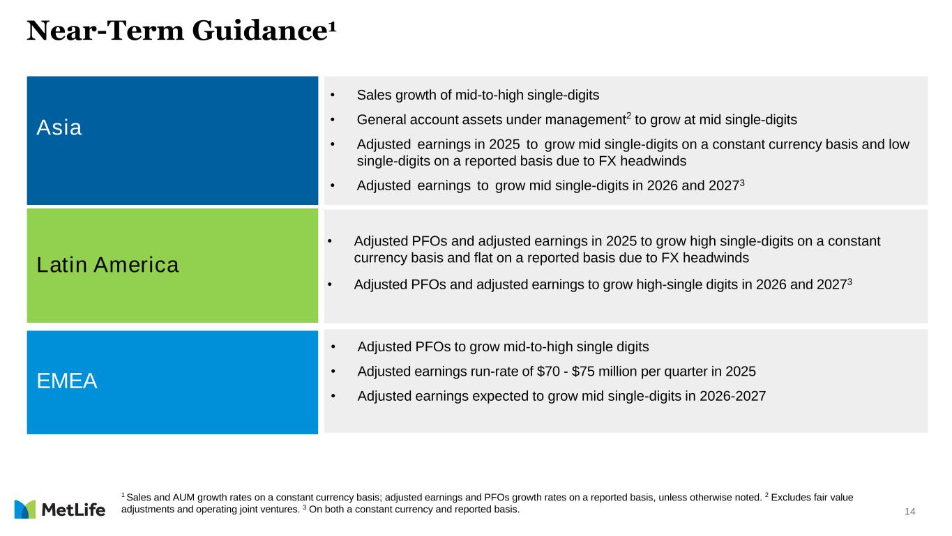 13 Near-Term Guidance • Adjusted premiums, fees and other revenues (PFOs) expected to grow annually 4-7% • Group Life mortality ratio of 84.5% in 2024; target of 84-89%1 • Group Non-Medical Health interest adjusted benefit ratio of 72.2% in 2024; target of 69-74%1 • Incremental adjusted earnings of 5-10% in 2025 from product mix, greater operating efficiencies and higher investment income • Liability exposures2 expected to grow 3-5% annually • General account investment spread3 of 117 bps in 2024; expected to be 110-135 bps in 2025 • Incremental adjusted earnings of ~5% from total fee and underwriting income, net of expenses • Adjusted PFOs expected to decline by 4-6% annually • Adjusted earnings of $650 - $800 million in 2025 Group Benefits Retirement and Income Solutions MetLife Holdings 1 Full year ratios reflect simple quarterly average. 2 Includes future policy benefits, policyholder account liabilities, and separate account liabilities, as well as notional amounts not recorded on MetLife's balance sheet. 3 Average annualized general account spread.