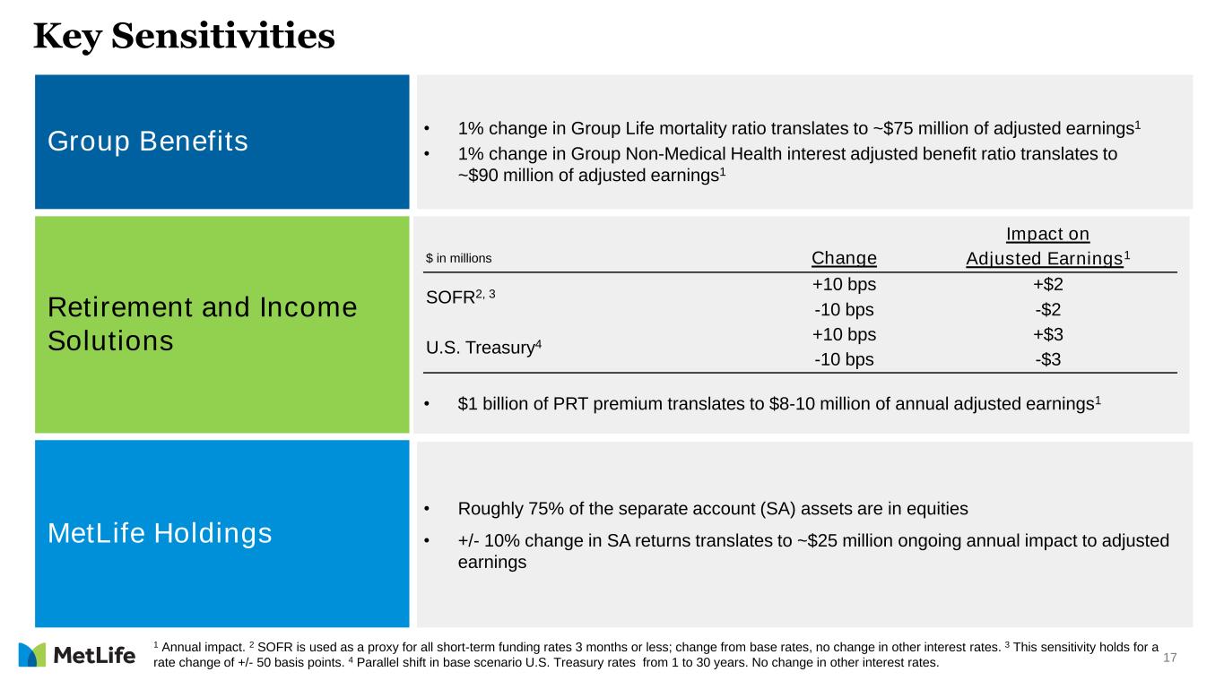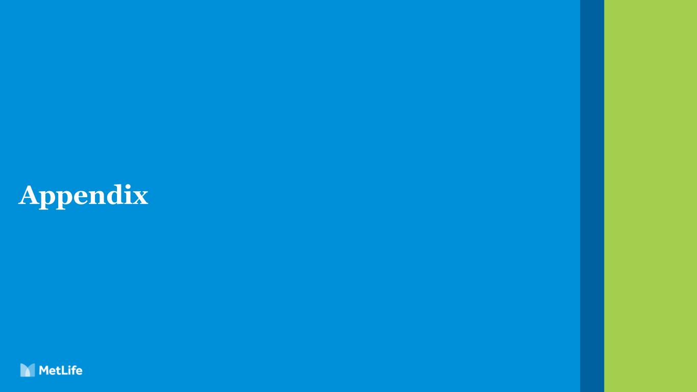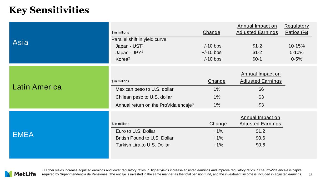17 Key Sensitivities • 1% change in Group Life mortality ratio translates to ~$75 million of adjusted earnings1 • 1% change in Group Non-Medical Health interest adjusted benefit ratio translates to ~$90 million of adjusted earnings1 • Roughly 75% of the separate account (SA) assets are in equities • +/- 10% change in SA returns translates to ~$25 million ongoing annual impact to adjusted earnings Group Benefits Retirement and Income Solutions MetLife Holdings Impact on $ in millions Change Adjusted Earnings1 SOFR2, 3 +10 bps +$2 -10 bps -$2 U.S. Treasury4 +10 bps +$3 -10 bps -$3 • $1 billion of PRT premium translates to $8-10 million of annual adjusted earnings1 1 Annual impact. 2 SOFR is used as a proxy for all short-term funding rates 3 months or less; change from base rates, no change in other interest rates. 3 This sensitivity holds for a rate change of +/- 50 basis points. 4 Parallel shift in base scenario U.S. Treasury rates from 1 to 30 years. No change in other interest rates.