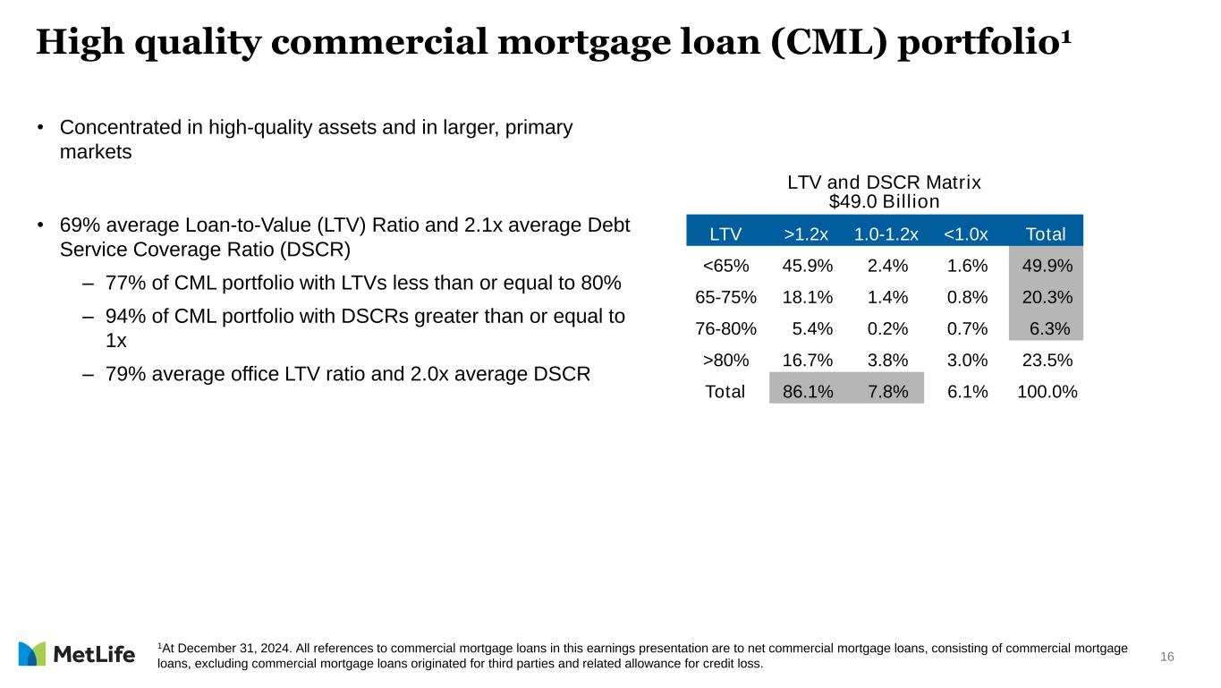 16 High quality commercial mortgage loan (CML) portfolio1 • Concentrated in high-quality assets and in larger, primary markets • 69% average Loan-to-Value (LTV) Ratio and 2.1x average Debt Service Coverage Ratio (DSCR) – 77% of CML portfolio with LTVs less than or equal to 80% – 94% of CML portfolio with DSCRs greater than or equal to 1x – 79% average office LTV ratio and 2.0x average DSCR 1At December 31, 2024. All references to commercial mortgage loans in this earnings presentation are to net commercial mortgage loans, consisting of commercial mortgage loans, excluding commercial mortgage loans originated for third parties and related allowance for credit loss. LTV and DSCR Matrix $49.0 Billion LTV >1.2x 1.0-1.2x <1.0x Total <65% 45.9% 2.4% 1.6% 49.9% 65-75% 18.1% 1.4% 0.8% 20.3% 76-80% 5.4% 0.2% 0.7% 6.3% >80% 16.7% 3.8% 3.0% 23.5% Total 86.1% 7.8% 6.1% 100.0%