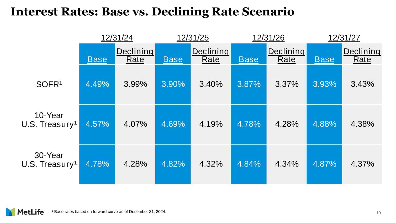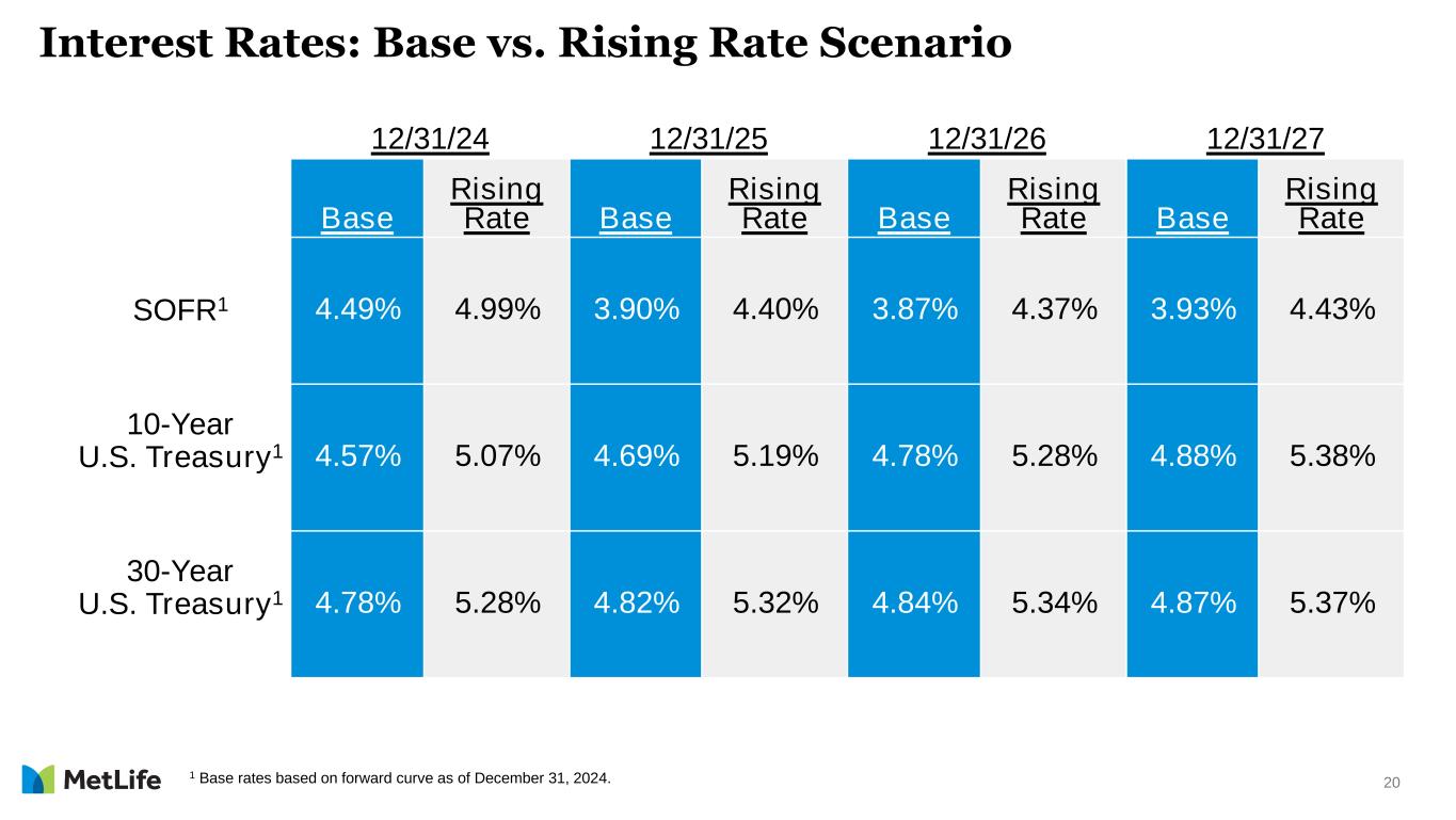 19 12/31/24 12/31/25 12/31/26 12/31/27 Base Declining Rate Base Declining Rate Base Declining Rate Base Declining Rate SOFR1 4.49% 3.99% 3.90% 3.40% 3.87% 3.37% 3.93% 3.43% 10-Year U.S. Treasury1 4.57% 4.07% 4.69% 4.19% 4.78% 4.28% 4.88% 4.38% 30-Year U.S. Treasury1 4.78% 4.28% 4.82% 4.32% 4.84% 4.34% 4.87% 4.37% Interest Rates: Base vs. Declining Rate Scenario 1 Base rates based on forward curve as of December 31, 2024.