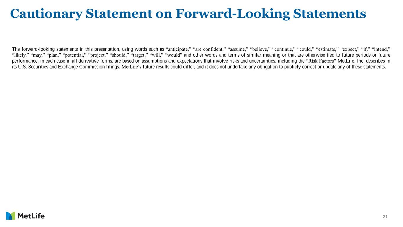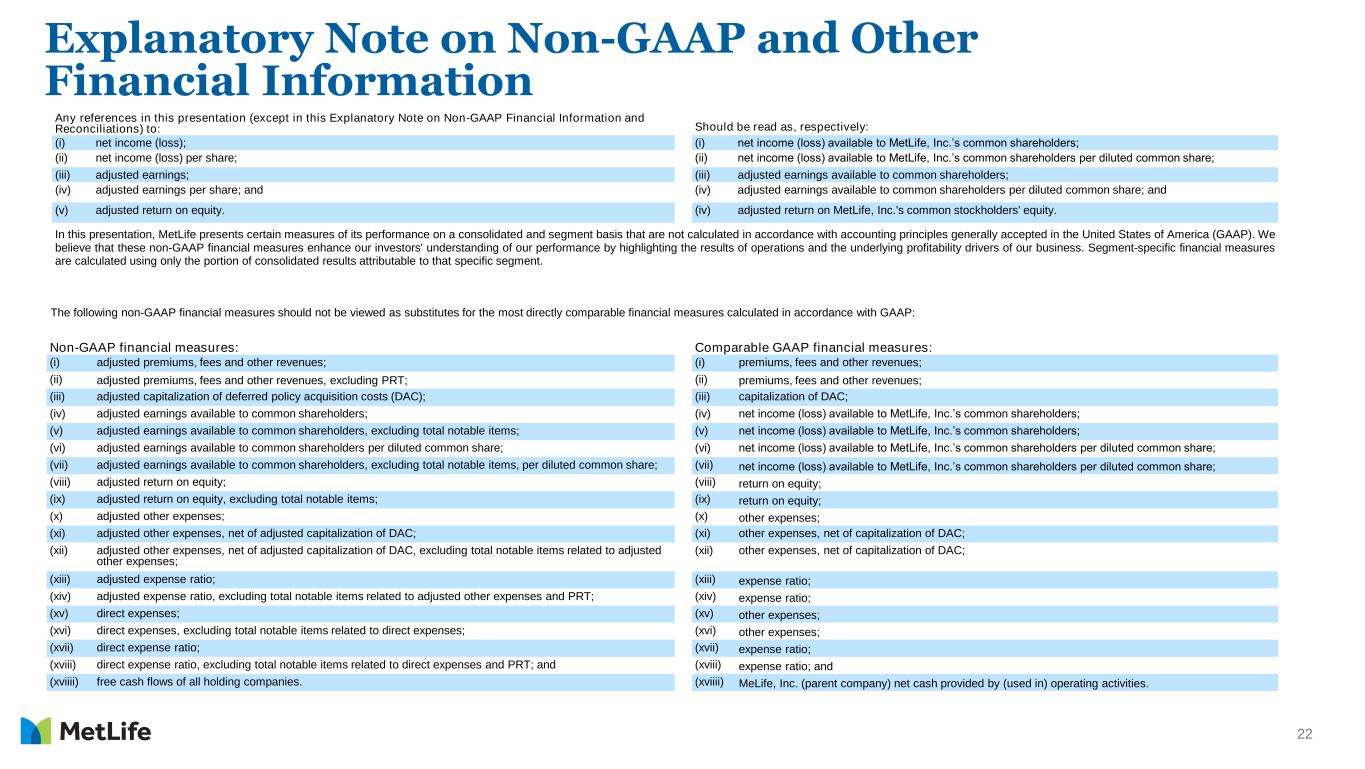 21 Cautionary Statement on Forward-Looking Statements The forward-looking statements in this presentation, using words such as “anticipate,” “are confident,” “assume,” “believe,” “continue,” “could,” “estimate,” “expect,” “if,” “intend,” “likely,” “may,” “plan,” “potential,” “project,” “should,” “target,” “will,” “would” and other words and terms of similar meaning or that are otherwise tied to future periods or future performance, in each case in all derivative forms, are based on assumptions and expectations that involve risks and uncertainties, including the “Risk Factors” MetLife, Inc. describes in its U.S. Securities and Exchange Commission filings. MetLife’s future results could differ, and it does not undertake any obligation to publicly correct or update any of these statements.