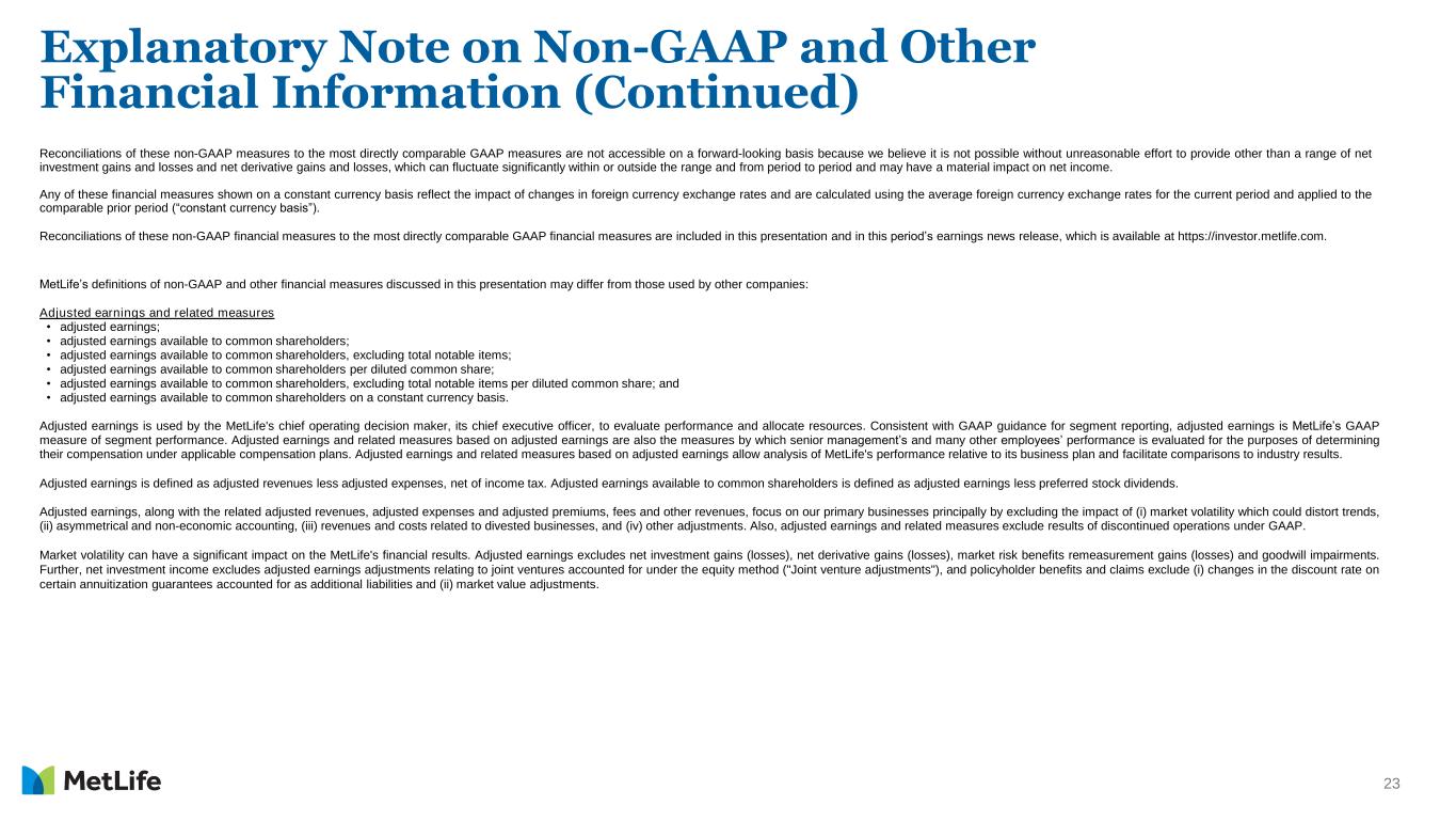 22 Explanatory Note on Non-GAAP and Other Financial Information Any references in this presentation (except in this Explanatory Note on Non-GAAP Financial Information and Reconciliations) to: Should be read as, respectively: (i) net income (loss); (i) net income (loss) available to MetLife, Inc.’s common shareholders; (ii) net income (loss) per share; (ii) net income (loss) available to MetLife, Inc.’s common shareholders per diluted common share; (iii) adjusted earnings; (iii) adjusted earnings available to common shareholders; (iv) adjusted earnings per share; and (iv) adjusted earnings available to common shareholders per diluted common share; and (v) adjusted return on equity. (iv) adjusted return on MetLife, Inc.'s common stockholders' equity. In this presentation, MetLife presents certain measures of its performance on a consolidated and segment basis that are not calculated in accordance with accounting principles generally accepted in the United States of America (GAAP). We believe that these non-GAAP financial measures enhance our investors' understanding of our performance by highlighting the results of operations and the underlying profitability drivers of our business. Segment-specific financial measures are calculated using only the portion of consolidated results attributable to that specific segment. The following non-GAAP financial measures should not be viewed as substitutes for the most directly comparable financial measures calculated in accordance with GAAP: Non-GAAP financial measures: Comparable GAAP financial measures: (i) adjusted premiums, fees and other revenues; (i) premiums, fees and other revenues; (ii) adjusted premiums, fees and other revenues, excluding PRT; (ii) premiums, fees and other revenues; (iii) adjusted capitalization of deferred policy acquisition costs (DAC); (iii) capitalization of DAC; (iv) adjusted earnings available to common shareholders; (iv) net income (loss) available to MetLife, Inc.’s common shareholders; (v) adjusted earnings available to common shareholders, excluding total notable items; (v) net income (loss) available to MetLife, Inc.’s common shareholders; (vi) adjusted earnings available to common shareholders per diluted common share; (vi) net income (loss) available to MetLife, Inc.’s common shareholders per diluted common share; (vii) adjusted earnings available to common shareholders, excluding total notable items, per diluted common share; (vii) net income (loss) available to MetLife, Inc.’s common shareholders per diluted common share; (viii) adjusted return on equity; (viii) return on equity; (ix) adjusted return on equity, excluding total notable items; (ix) return on equity; (x) adjusted other expenses; (x) other expenses; (xi) adjusted other expenses, net of adjusted capitalization of DAC; (xi) other expenses, net of capitalization of DAC; (xii) adjusted other expenses, net of adjusted capitalization of DAC, excluding total notable items related to adjusted other expenses; (xii) other expenses, net of capitalization of DAC; (xiii) adjusted expense ratio; (xiii) expense ratio; (xiv) adjusted expense ratio, excluding total notable items related to adjusted other expenses and PRT; (xiv) expense ratio; (xv) direct expenses; (xv) other expenses; (xvi) direct expenses, excluding total notable items related to direct expenses; (xvi) other expenses; (xvii) direct expense ratio; (xvii) expense ratio; (xviii) direct expense ratio, excluding total notable items related to direct expenses and PRT; and (xviii) expense ratio; and (xviiii) free cash flows of all holding companies. (xviiii) MeLife, Inc. (parent company) net cash provided by (used in) operating activities.
