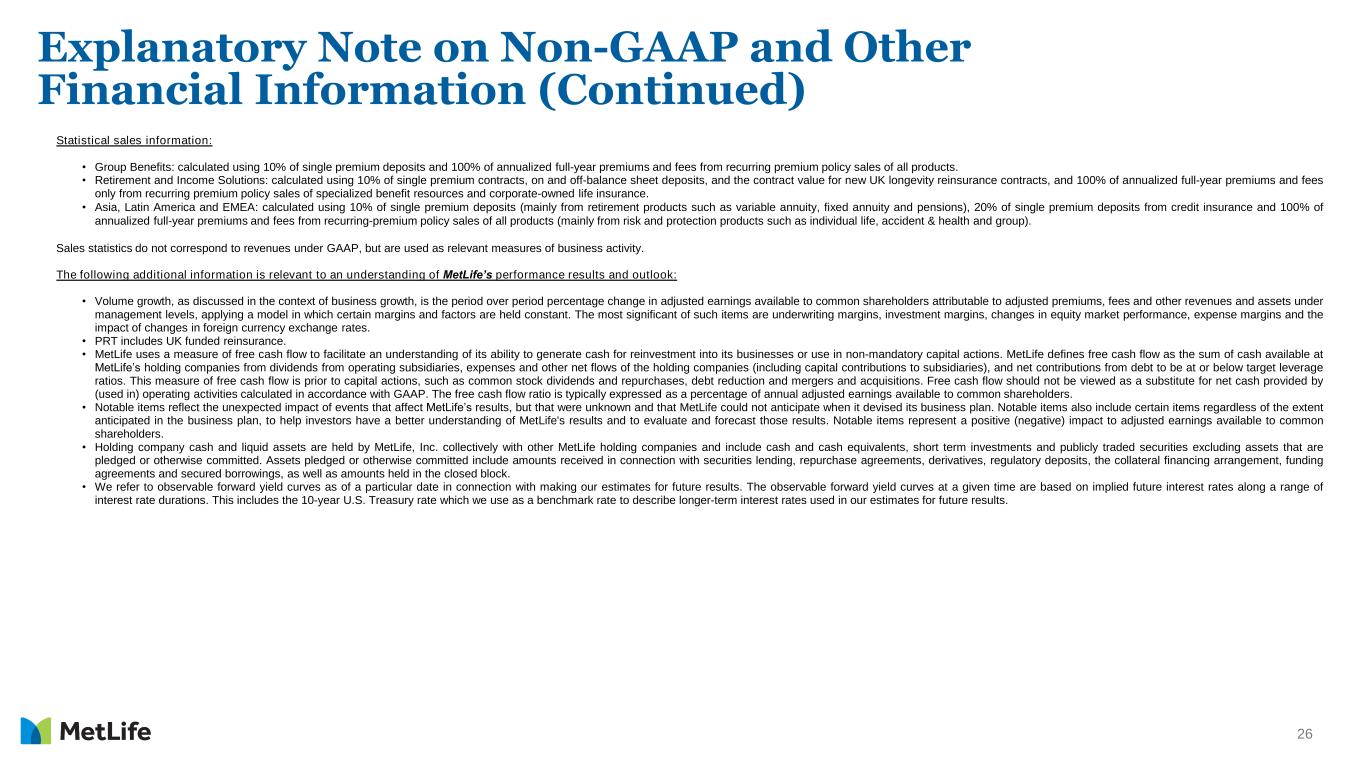 25 Explanatory Note on Non-GAAP and Other Financial Information (Continued) Return on equity and related measures • Total MetLife, Inc.’s adjusted common stockholders’ equity: total MetLife, Inc.’s common stockholders’ equity, excluding unrealized investment gains (losses), net of related offsets, deferred gains (losses) on derivatives, future policy benefits discount rate remeasurement gains (losses), market risk benefits instrument-specific credit risk remeasurement gains (losses) and defined benefit plans adjustment components of AOCI (AOCI other than FCTA) and the estimated fair value of certain ceded reinsurance-related embedded derivatives, all net of income tax. • Total MetLife, Inc.’s adjusted common stockholders’ equity, excluding total notable items: total MetLife, Inc.’s common stockholders’ equity, excluding unrealized investment gains (losses), net of related offsets, deferred gains (losses) on derivatives, future policy benefits discount rate remeasurement gains (losses), market risk benefits instrument-specific credit risk remeasurement gains (losses) and defined benefit plans adjustment components of AOCI (AOCI other than FCTA), the estimated fair value of certain ceded reinsurance-related embedded derivatives and total notable items, all net of income tax. • Return on MetLife, Inc.’s common stockholders’ equity: net income (loss) available to MetLife, Inc.’s common shareholders divided by MetLife, Inc.'s average common stockholders’ equity. • Adjusted return on MetLife, Inc.’s common stockholders’ equity: adjusted earnings available to common shareholders divided by MetLife, Inc.'s average adjusted common stockholders’ equity. • Adjusted return on MetLife, Inc.’s common stockholders’ equity, excluding total notable items: adjusted earnings available to common shareholders, excluding total notable items, divided by MetLife, Inc.'s average adjusted common stockholders’ equity, excluding total notable items. The above measures represent a level of equity that excludes most components of AOCI, such as unrealized investment gains (losses) and future policy benefits discount rate remeasurement gains (losses), as well as the impact of certain ceded reinsurance-related embedded derivatives, as these amounts are primarily driven by market volatility. Expense ratio, direct expense ratio, adjusted expense ratio and related measures • Expense ratio: other expenses, net of capitalization of DAC, divided by premiums, fees and other revenues. • Direct expense ratio: adjusted direct expenses, divided by adjusted premiums, fees and other revenues. Direct expenses are comprised of employee-related costs, third-party staffing costs, and general and administrative expenses. • Direct expense ratio, excluding total notable items related to direct expenses and PRT: adjusted direct expenses, excluding total notable items related to direct expenses, divided by adjusted premiums, fees and other revenues, excluding PRT. • Adjusted expense ratio: adjusted other expenses, net of adjusted capitalization of DAC, divided by adjusted premiums, fees and other revenues. • Adjusted expense ratio, excluding total notable items related to adjusted other expenses and PRT: adjusted other expenses, net of adjusted capitalization of DAC, excluding total notable items related to adjusted other expenses, divided by adjusted premiums, fees and other revenues, excluding PRT. General Account (GA) assets under management (GA AUM) GA AUM is used by MetLife to describe assets in its GA investment portfolio. GA AUM is stated at estimated fair value and is comprised of GA total investments, the portion of the GA investment portfolio classified within assets held-for-sale, cash and cash equivalents and accrued investment income on such assets, excluding policy loans, contractholder-directed equity securities fair value option securities, mortgage loans originated for third parties, assets subject to reinsurance arrangements with third-party reinsurers, and certain other invested assets. Mortgage loans, net of mortgage loans originated for third parties (“net mortgage loans”) (including commercial (“net commercial mortgage loans”), agricultural ("net agricultural mortgage loans") and residential mortgage loans) and real estate equity (including real estate and real estate joint ventures) included in GA AUM (at net asset value, net of deduction for encumbering debt) have been adjusted from carrying value to estimated fair value. Classification of GA AUM by sector is based on the nature and characteristics of the underlying investments which can vary from how they are classified under GAAP. Accordingly, the underlying investments within certain real estate and real estate joint ventures that are primarily net commercial mortgage loans (at net asset value, net of deduction for encumbering debt) have been reclassified to exclude them from real estate equity and include them as net commercial mortgage loans. Asia GA AUM and related measures Asia GA AUM is used by MetLife to describe assets in its Asia GA investment portfolio. Asia GA AUM is stated at estimated fair value and is comprised of Asia GA total investments, the portion of the Asia GA investment portfolio classified within assets held-for-sale, cash and cash equivalents, and accrued investment income on such assets, excluding policy loans, contractholder-directed equity securities, fair value option securities, mortgage loans originated for third parties, assets subject to reinsurance arrangements with third-party reinsurers, and certain other invested assets. Mortgage loans, net of mortgage loans originated for third parties ("net mortgage loans") (including commercial ("net commercial mortgage loans"), agricultural ("net agricultural mortgage loans") and residential mortgage loans) and real estate equity (including real estate and real estate joint ventures) included in Asia GA AUM (at net asset value, ne