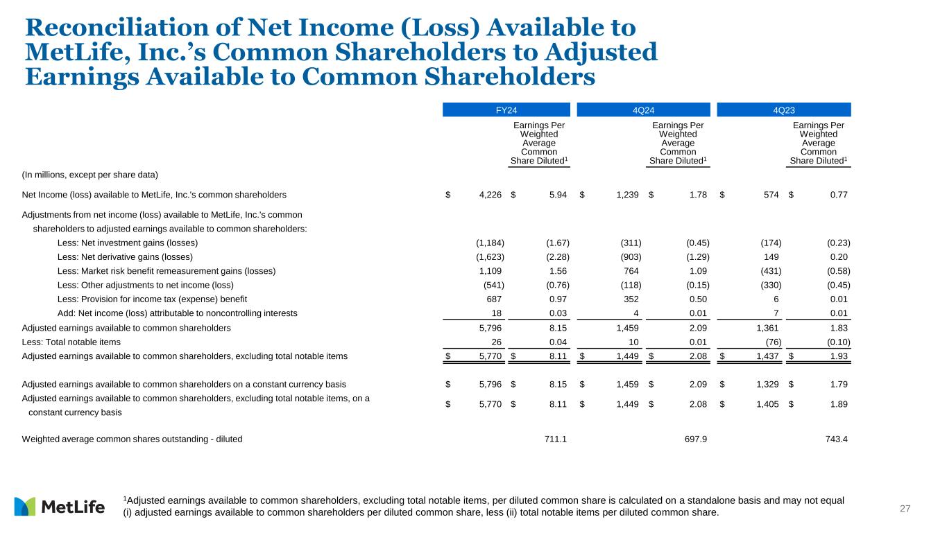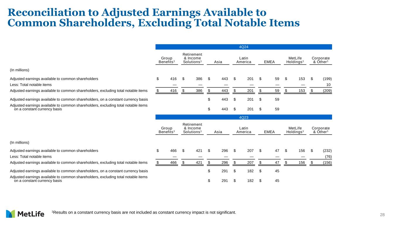 27 Reconciliation of Net Income (Loss) Available to MetLife, Inc.’s Common Shareholders to Adjusted Earnings Available to Common Shareholders FY24 4Q24 4Q23 Earnings Per Weighted Average Common Share Diluted1 Earnings Per Weighted Average Common Share Diluted1 Earnings Per Weighted Average Common Share Diluted1 (In millions, except per share data) Net Income (loss) available to MetLife, Inc.'s common shareholders $ 4,226 $ 5.94 $ 1,239 $ 1.78 $ 574 $ 0.77 Adjustments from net income (loss) available to MetLife, Inc.'s common shareholders to adjusted earnings available to common shareholders: Less: Net investment gains (losses) (1,184) (1.67) (311) (0.45) (174) (0.23) Less: Net derivative gains (losses) (1,623) (2.28) (903) (1.29) 149 0.20 Less: Market risk benefit remeasurement gains (losses) 1,109 1.56 764 1.09 (431) (0.58) Less: Other adjustments to net income (loss) (541) (0.76) (118) (0.15) (330) (0.45) Less: Provision for income tax (expense) benefit 687 0.97 352 0.50 6 0.01 Add: Net income (loss) attributable to noncontrolling interests 18 0.03 4 0.01 7 0.01 Adjusted earnings available to common shareholders 5,796 8.15 1,459 2.09 1,361 1.83 Less: Total notable items 26 0.04 10 0.01 (76) (0.10) Adjusted earnings available to common shareholders, excluding total notable items $ 5,770 $ 8.11 $ 1,449 $ 2.08 $ 1,437 $ 1.93 Adjusted earnings available to common shareholders on a constant currency basis $ 5,796 $ 8.15 $ 1,459 $ 2.09 $ 1,329 $ 1.79 Adjusted earnings available to common shareholders, excluding total notable items, on a $ 5,770 $ 8.11 $ 1,449 $ 2.08 $ 1,405 $ 1.89 constant currency basis Weighted average common shares outstanding - diluted 711.1 697.9 743.4 1Adjusted earnings available to common shareholders, excluding total notable items, per diluted common share is calculated on a standalone basis and may not equal (i) adjusted earnings available to common shareholders per diluted common share, less (ii) total notable items per diluted common share.