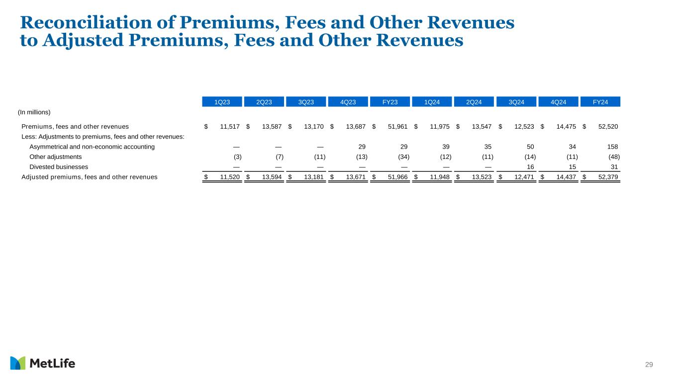 28 Reconciliation to Adjusted Earnings Available to Common Shareholders, Excluding Total Notable Items 4Q24 Group Benefits1 Retirement & Income Solutions1 Asia Latin America EMEA MetLife Holdings1 Corporate & Other1 (In millions) Adjusted earnings available to common shareholders $ 416 $ 386 $ 443 $ 201 $ 59 $ 153 $ (199) Less: Total notable items — — — — — — 10 Adjusted earnings available to common shareholders, excluding total notable items $ 416 $ 386 $ 443 $ 201 $ 59 $ 153 $ (209) Adjusted earnings available to common shareholders, on a constant currency basis $ 443 $ 201 $ 59 Adjusted earnings available to common shareholders, excluding total notable items on a constant currency basis $ 443 $ 201 $ 59 4Q23 Group Benefits1 Retirement & Income Solutions1 Asia Latin America EMEA MetLife Holdings1 Corporate & Other1 (In millions) Adjusted earnings available to common shareholders $ 466 $ 421 $ 296 $ 207 $ 47 $ 156 $ (232) Less: Total notable items — — — — — — (76) Adjusted earnings available to common shareholders, excluding total notable items $ 466 $ 421 $ 296 $ 207 $ 47 $ 156 $ (156) Adjusted earnings available to common shareholders, on a constant currency basis $ 291 $ 182 $ 45 Adjusted earnings available to common shareholders, excluding total notable items on a constant currency basis $ 291 $ 182 $ 45 1Results on a constant currency basis are not included as constant currency impact is not significant.