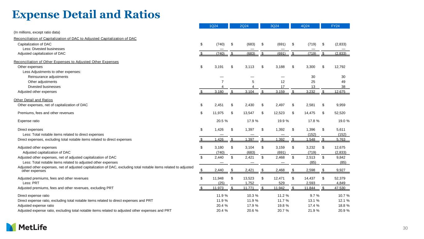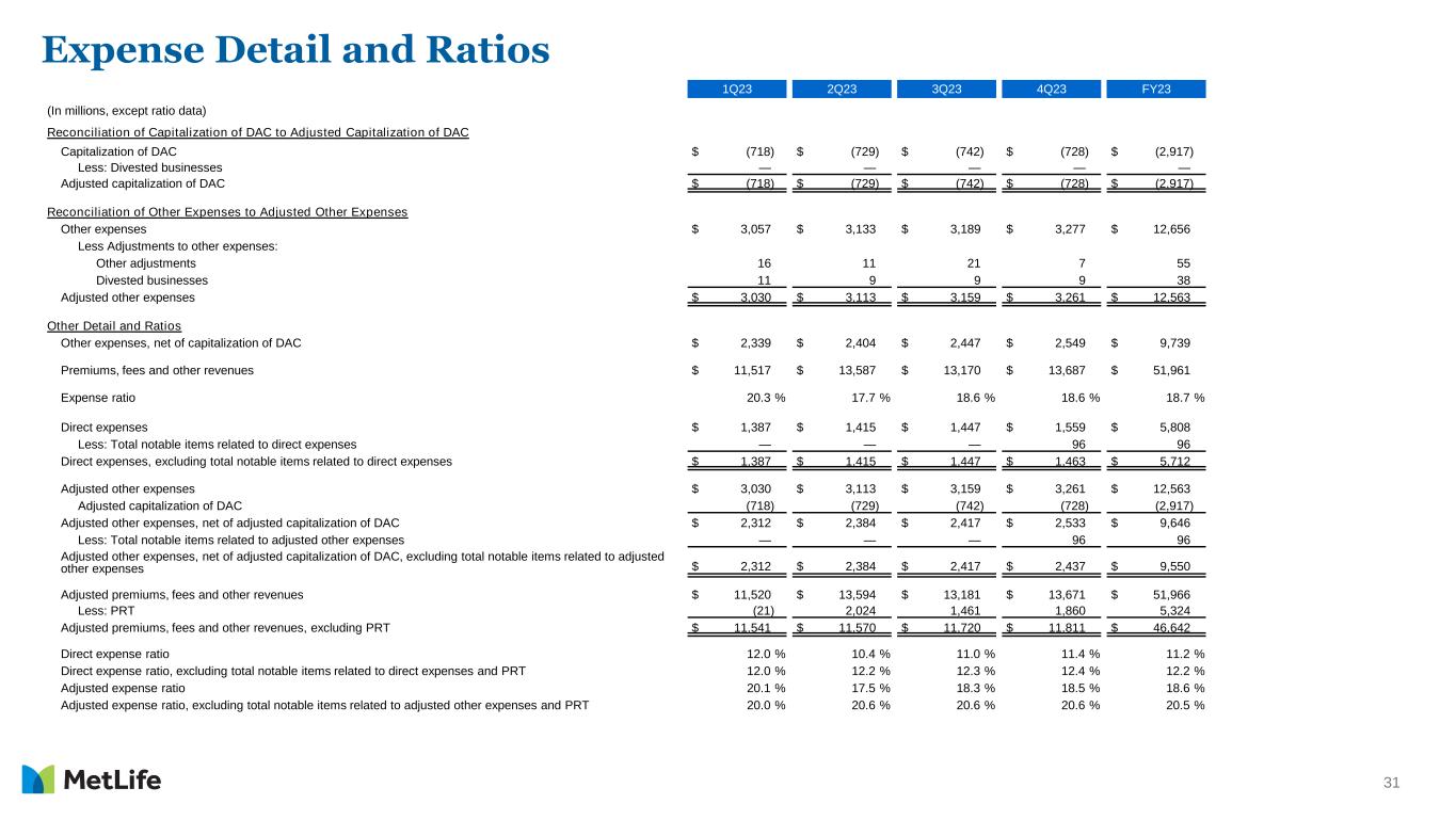 30 Expense Detail and Ratios 1Q24 2Q24 3Q24 4Q24 FY24 (In millions, except ratio data) Reconciliation of Capitalization of DAC to Adjusted Capitalization of DAC Capitalization of DAC $ (740) $ (683) $ (691) $ (719) $ (2,833) Less: Divested businesses — — — — — Adjusted capitalization of DAC $ (740) $ (683) $ (691) $ (719) $ (2,833) Reconciliation of Other Expenses to Adjusted Other Expenses Other expenses $ 3,191 $ 3,113 $ 3,188 $ 3,300 $ 12,792 Less Adjustments to other expenses: Reinsurance adjustments — — — 30 30 Other adjustments 7 5 12 25 49 Divested businesses 4 4 17 13 38 Adjusted other expenses $ 3,180 $ 3,104 $ 3,159 $ 3,232 $ 12,675 Other Detail and Ratios Other expenses, net of capitalization of DAC $ 2,451 $ 2,430 $ 2,497 $ 2,581 $ 9,959 Premiums, fees and other revenues $ 11,975 $ 13,547 $ 12,523 $ 14,475 $ 52,520 Expense ratio 20.5 % 17.9 % 19.9 % 17.8 % 19.0 % Direct expenses $ 1,426 $ 1,397 $ 1,392 $ 1,396 $ 5,611 Less: Total notable items related to direct expenses — — — (152) (152) Direct expenses, excluding total notable items related to direct expenses $ 1,426 $ 1,397 $ 1,392 $ 1,548 $ 5,763 Adjusted other expenses $ 3,180 $ 3,104 $ 3,159 $ 3,232 $ 12,675 Adjusted capitalization of DAC (740) (683) (691) (719) (2,833) Adjusted other expenses, net of adjusted capitalization of DAC $ 2,440 $ 2,421 $ 2,468 $ 2,513 $ 9,842 Less: Total notable items related to adjusted other expenses — — — (85) (85) Adjusted other expenses, net of adjusted capitalization of DAC, excluding total notable items related to adjusted other expenses $ 2,440 $ 2,421 $ 2,468 $ 2,598 $ 9,927 Adjusted premiums, fees and other revenues $ 11,948 $ 13,523 $ 12,471 $ 14,437 $ 52,379 Less: PRT (25) 1,752 529 2,593 4,849 Adjusted premiums, fees and other revenues, excluding PRT $ 11,973 $ 11,771 $ 11,942 $ 11,844 $ 47,530 Direct expense ratio 11.9 % 10.3 % 11.2 % 9.7 % 10.7 % Direct expense ratio, excluding total notable items related to direct expenses and PRT 11.9 % 11.9 % 11.7 % 13.1 % 12.1 % Adjusted expense ratio 20.4 % 17.9 % 19.8 % 17.4 % 18.8 % Adjusted expense ratio, excluding total notable items related to adjusted other expenses and PRT 20.4 % 20.6 % 20.7 % 21.9 % 20.9 %