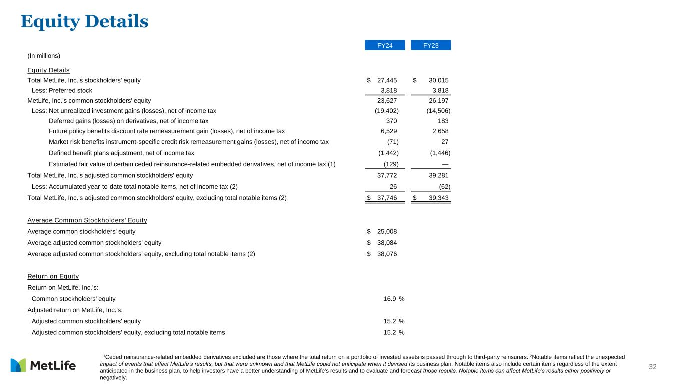 32 Equity Details FY24 FY23 (In millions) Equity Details Total MetLife, Inc.'s stockholders' equity $ 27,445 $ 30,015 Less: Preferred stock 3,818 3,818 MetLife, Inc.'s common stockholders' equity 23,627 26,197 Less: Net unrealized investment gains (losses), net of income tax (19,402) (14,506) Deferred gains (losses) on derivatives, net of income tax 370 183 Future policy benefits discount rate remeasurement gain (losses), net of income tax 6,529 2,658 Market risk benefits instrument-specific credit risk remeasurement gains (losses), net of income tax (71) 27 Defined benefit plans adjustment, net of income tax (1,442) (1,446) Estimated fair value of certain ceded reinsurance-related embedded derivatives, net of income tax (1) (129) — Total MetLife, Inc.'s adjusted common stockholders' equity 37,772 39,281 Less: Accumulated year-to-date total notable items, net of income tax (2) 26 (62) Total MetLife, Inc.'s adjusted common stockholders' equity, excluding total notable items (2) $ 37,746 $ 39,343 Average Common Stockholders' Equity Average common stockholders' equity $ 25,008 Average adjusted common stockholders' equity $ 38,084 Average adjusted common stockholders' equity, excluding total notable items (2) $ 38,076 Return on Equity Return on MetLife, Inc.'s: Common stockholders' equity 16.9 % Adjusted return on MetLife, Inc.'s: Adjusted common stockholders' equity 15.2 % Adjusted common stockholders' equity, excluding total notable items 15.2 % 1Ceded reinsurance-related embedded derivatives excluded are those where the total return on a portfolio of invested assets is passed through to third-party reinsurers. 2Notable items reflect the unexpected impact of events that affect MetLife’s results, but that were unknown and that MetLife could not anticipate when it devised its business plan. Notable items also include certain items regardless of the extent anticipated in the business plan, to help investors have a better understanding of MetLife's results and to evaluate and forecast those results. Notable items can affect MetLife’s results either positively or negatively.