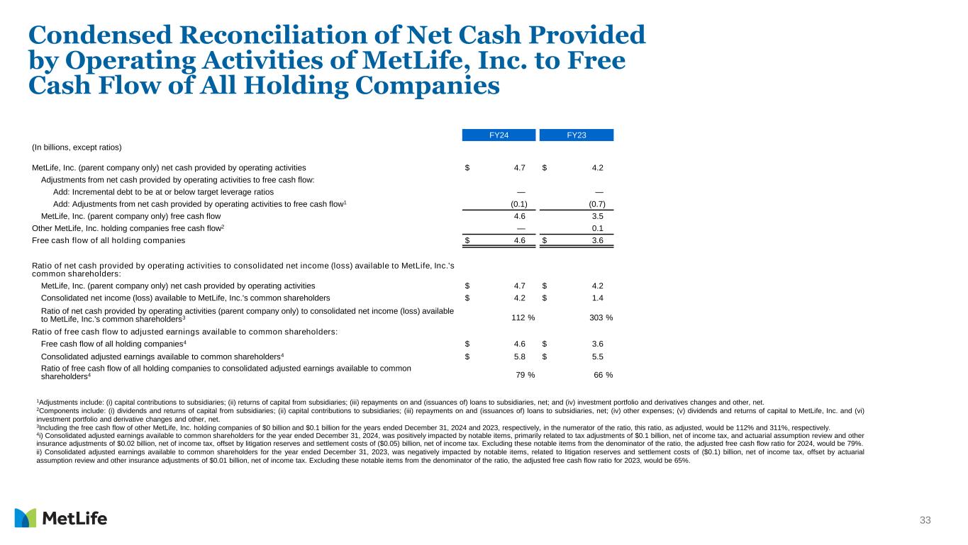 33 Condensed Reconciliation of Net Cash Provided by Operating Activities of MetLife, Inc. to Free Cash Flow of All Holding Companies FY24 FY23 (In billions, except ratios) MetLife, Inc. (parent company only) net cash provided by operating activities $ 4.7 $ 4.2 Adjustments from net cash provided by operating activities to free cash flow: Add: Incremental debt to be at or below target leverage ratios — — Add: Adjustments from net cash provided by operating activities to free cash flow1 (0.1) (0.7) MetLife, Inc. (parent company only) free cash flow 4.6 3.5 Other MetLife, Inc. holding companies free cash flow2 — 0.1 Free cash flow of all holding companies $ 4.6 $ 3.6 Ratio of net cash provided by operating activities to consolidated net income (loss) available to MetLife, Inc.'s common shareholders: MetLife, Inc. (parent company only) net cash provided by operating activities $ 4.7 $ 4.2 Consolidated net income (loss) available to MetLife, Inc.'s common shareholders $ 4.2 $ 1.4 Ratio of net cash provided by operating activities (parent company only) to consolidated net income (loss) available to MetLife, Inc.'s common shareholders3 112 % 303 % Ratio of free cash flow to adjusted earnings available to common shareholders: Free cash flow of all holding companies4 $ 4.6 $ 3.6 Consolidated adjusted earnings available to common shareholders4 $ 5.8 $ 5.5 Ratio of free cash flow of all holding companies to consolidated adjusted earnings available to common shareholders4 79 % 66 % 1Adjustments include: (i) capital contributions to subsidiaries; (ii) returns of capital from subsidiaries; (iii) repayments on and (issuances of) loans to subsidiaries, net; and (iv) investment portfolio and derivatives changes and other, net. 2Components include: (i) dividends and returns of capital from subsidiaries; (ii) capital contributions to subsidiaries; (iii) repayments on and (issuances of) loans to subsidiaries, net; (iv) other expenses; (v) dividends and returns of capital to MetLife, Inc. and (vi) investment portfolio and derivative changes and other, net. 3Including the free cash flow of other MetLife, Inc. holding companies of $0 billion and $0.1 billion for the years ended December 31, 2024 and 2023, respectively, in the numerator of the ratio, this ratio, as adjusted, would be 112% and 311%, respectively. 4i) Consolidated adjusted earnings available to common shareholders for the year ended December 31, 2024, was positively impacted by notable items, primarily related to tax adjustments of $0.1 billion, net of income tax, and actuarial assumption review and other insurance adjustments of $0.02 billion, net of income tax, offset by litigation reserves and settlement costs of ($0.05) billion, net of income tax. Excluding these notable items from the denominator of the ratio, the adjusted free cash flow ratio for 2024, would be 79%. ii) Consolidated adjusted earnings available to common shareholders for the year ended December 31, 2023, was negatively impacted by notable items, related to litigation reserves and settlement costs of ($0.1) billion, net of income tax, offset by actuarial assumption review and other insurance adjustments of $0.01 billion, net of income tax. Excluding these notable items from the denominator of the ratio, the adjusted free cash flow ratio for 2023, would be 65%.