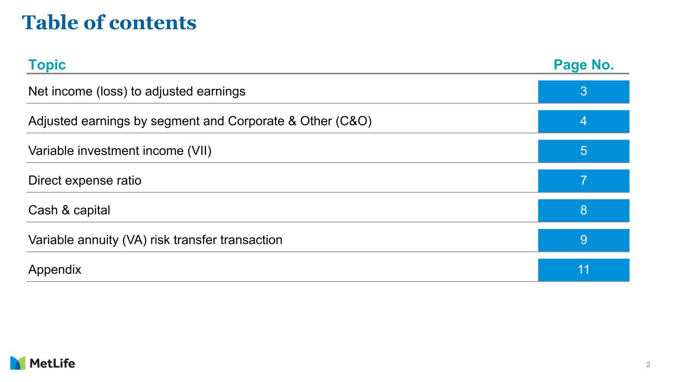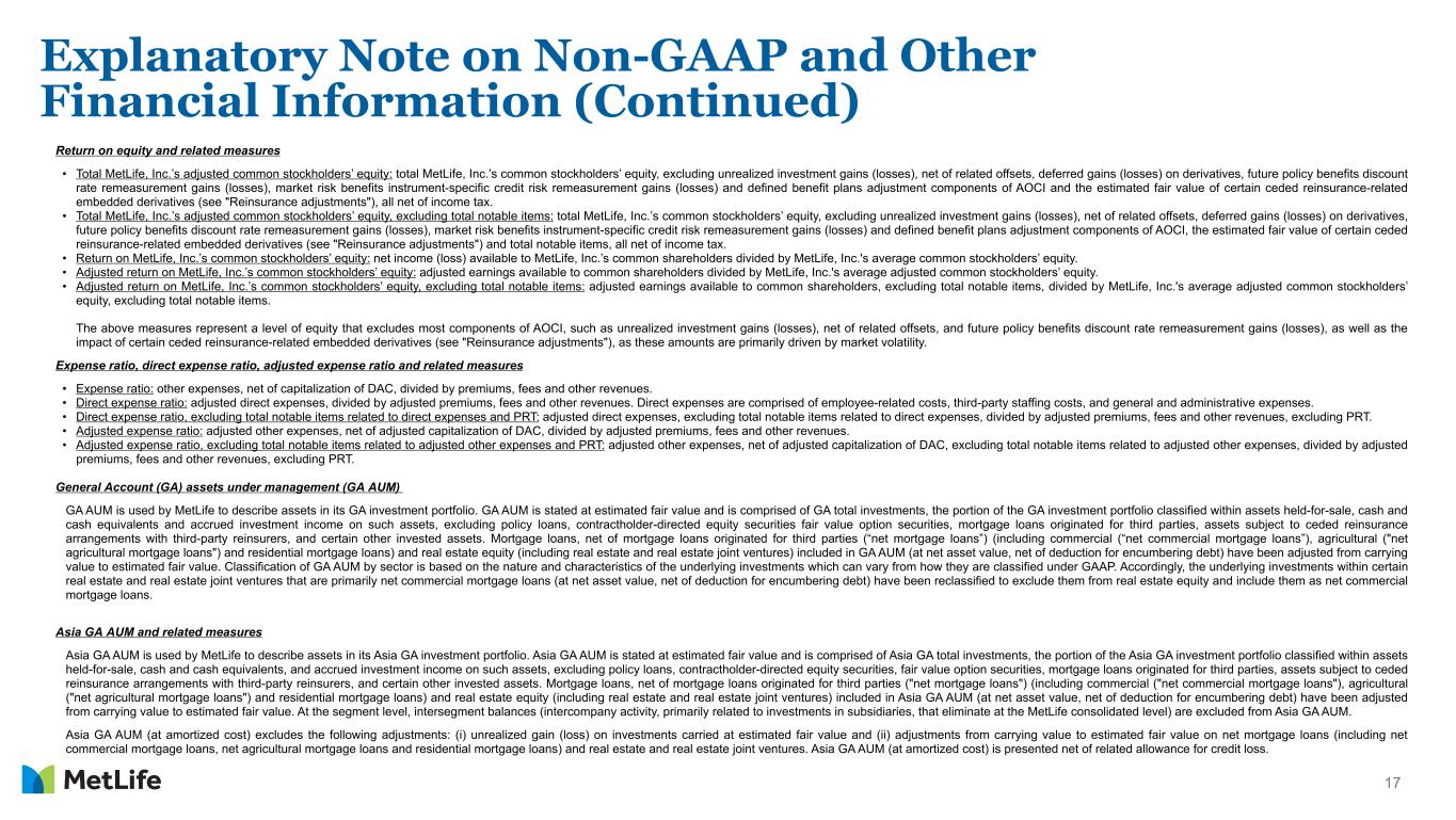 16 Explanatory Note on Non-GAAP and Other Financial Information (Continued) Asymmetrical and non-economic accounting adjustments are made to the line items indicated in calculating adjusted earnings: • Net investment income includes earned income on derivatives and amortization of premium on derivatives that are hedges of investments or that are used to replicate certain investments, but do not qualify for hedge accounting treatment ("Investment hedge adjustments"). • Other revenues include settlements of foreign currency earnings hedges and exclude asymmetrical accounting associated with in-force reinsurance. • Policyholder benefits and claims excludes (i) amortization of basis adjustments associated with de-designated fair value hedges of future policy benefits, (ii) inflation-indexed benefit adjustments associated with contracts backed by inflation- indexed investments, (iii) asymmetrical accounting associated with in-force reinsurance, and (iv) non-economic losses incurred at contract inception for certain single premium annuity business. These losses are amortized into adjusted earnings within policyholder benefits and claims over the estimated lives of the contracts. • Policyholder liability remeasurement gains (losses) excludes asymmetrical accounting associated with in-force reinsurance. • Interest credited to policyholder account balances excludes amounts associated with periodic crediting rate adjustments based on the total return of a contractually referenced pool of assets and other pass-through adjustments and asymmetrical accounting associated with in-force reinsurance. "Divested businesses" are those that have been or will be sold or exited by MetLife but do not meet the discontinued operations criteria under GAAP. Divested businesses also include the net impact of transactions with exited businesses that have been eliminated in consolidation under GAAP and costs relating to businesses that have been or will be sold or exited by MetLife that do not meet the criteria to be included in results of discontinued operations under GAAP. "Reinsurance adjustments" relate to balances subject to ceded reinsurance arrangements with third parties and the related investment returns and other expenses which are passed through to the third-party reinsurers. Other adjustments are made in calculating adjusted earnings: • Net investment income and interest credited to policyholder account balances excludes certain amounts related to contractholder-directed equity securities ("Unit-linked contract income") and ("Unit-linked contract costs"). Net investment income also excludes Reinsurance adjustments. • Other revenues include fee revenue on synthetic guaranteed interest contracts ("GICs") accounted for as freestanding derivatives. • Other revenues exclude and other expenses include fees received in connection with services provided under transition service agreements. • Other expenses exclude (i) Reinsurance adjustments, (ii) implementation of new insurance regulatory requirements and other costs, and (iii) acquisition, integration and other related costs. Other expenses include (i) deductions for net income attributable to noncontrolling interests, and (ii) benefits accrued on synthetic GICs accounted for as freestanding derivatives. Adjusted earnings also excludes the recognition of certain contingent assets and liabilities that could not be recognized at acquisition or adjusted for during the measurement period under GAAP business combination accounting guidance. The tax impact of the adjustments mentioned above are calculated net of the U.S. or foreign statutory tax rate, which could differ from MetLife's effective tax rate. Additionally, the provision for income tax (expense) benefit also includes the impact related to the timing of certain tax credits, as well as certain tax reforms. In addition, adjusted earnings available to common shareholders excludes the impact of preferred stock redemption premium, which is reported as a reduction to net income (loss) available to MetLife, Inc.’s common shareholders. Investment portfolio gains (losses) and derivative gains (losses) These are measures of investment and hedging activity. Investment portfolio gains (losses) principally excludes amounts that are reported within net investment gains (losses) but do not relate to the performance of the investment portfolio, such as gains (losses) on sales and divestitures of businesses, as well as investment portfolio gains (losses) of divested businesses. Derivative gains (losses) principally excludes earned income on derivatives and amortization of premium on derivatives, where such derivatives are either hedges of investments or are used to replicate certain investments, and where such derivatives do not qualify for hedge accounting. This earned income and amortization of premium is reported within adjusted earnings and not within derivative gains (losses).