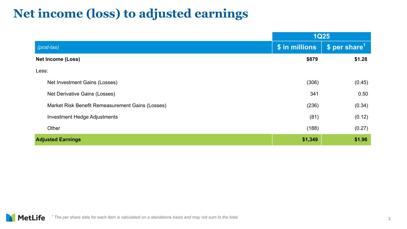 2 Topic Page No. Net income (loss) to adjusted earnings 3 Adjusted earnings by segment and Corporate & Other (C&O) 4 Variable investment income (VII) 5 Direct expense ratio 7 Cash & capital 8 Variable annuity (VA) risk transfer transaction 9 Appendix 11 Table of contents