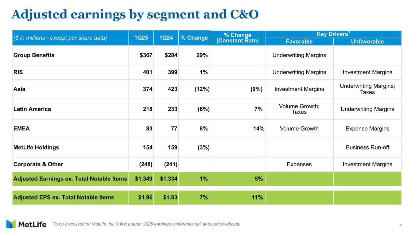 1Q25 Supplemental Slides1 John McCallion Chief Financial Officer and Head of MetLife Investment Management Exhibit 99.4 1 These slides highlight information in MetLife, Inc.'s earnings release, quarterly financial supplement and other prior public disclosures.