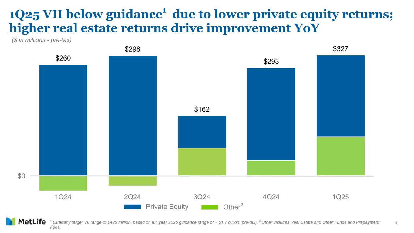 4 1 To be discussed on MetLife, Inc.'s first quarter 2025 earnings conference call and audio webcast. ($ in millions - except per share data) 1Q25 1Q24 % Change % Change (Constant Rate) Key Drivers1 Favorable Unfavorable Group Benefits $367 $284 29% Underwriting Margins RIS 401 399 1% Underwriting Margins Investment Margins Asia 374 423 (12%) (9%) Investment Margins Underwriting Margins; Taxes Latin America 218 233 (6%) 7% Volume Growth; Taxes Underwriting Margins EMEA 83 77 8% 14% Volume Growth Expense Margins MetLife Holdings 154 159 (3%) Business Run-off Corporate & Other (248) (241) Expenses Investment Margins Adjusted Earnings ex. Total Notable Items $1,349 $1,334 1% 5% Adjusted EPS ex. Total Notable Items $1.96 $1.83 7% 11% Adjusted earnings by segment and C&O