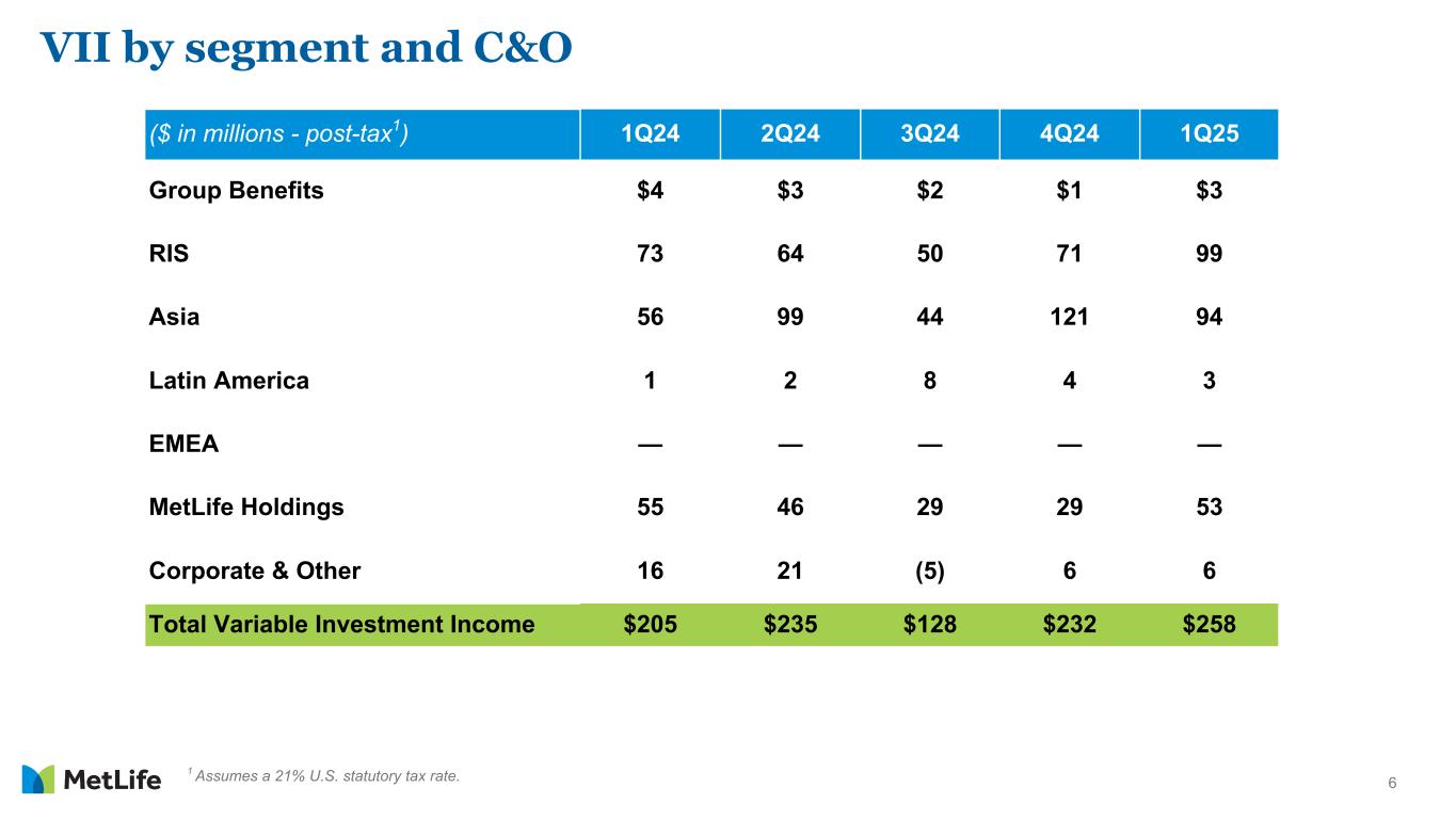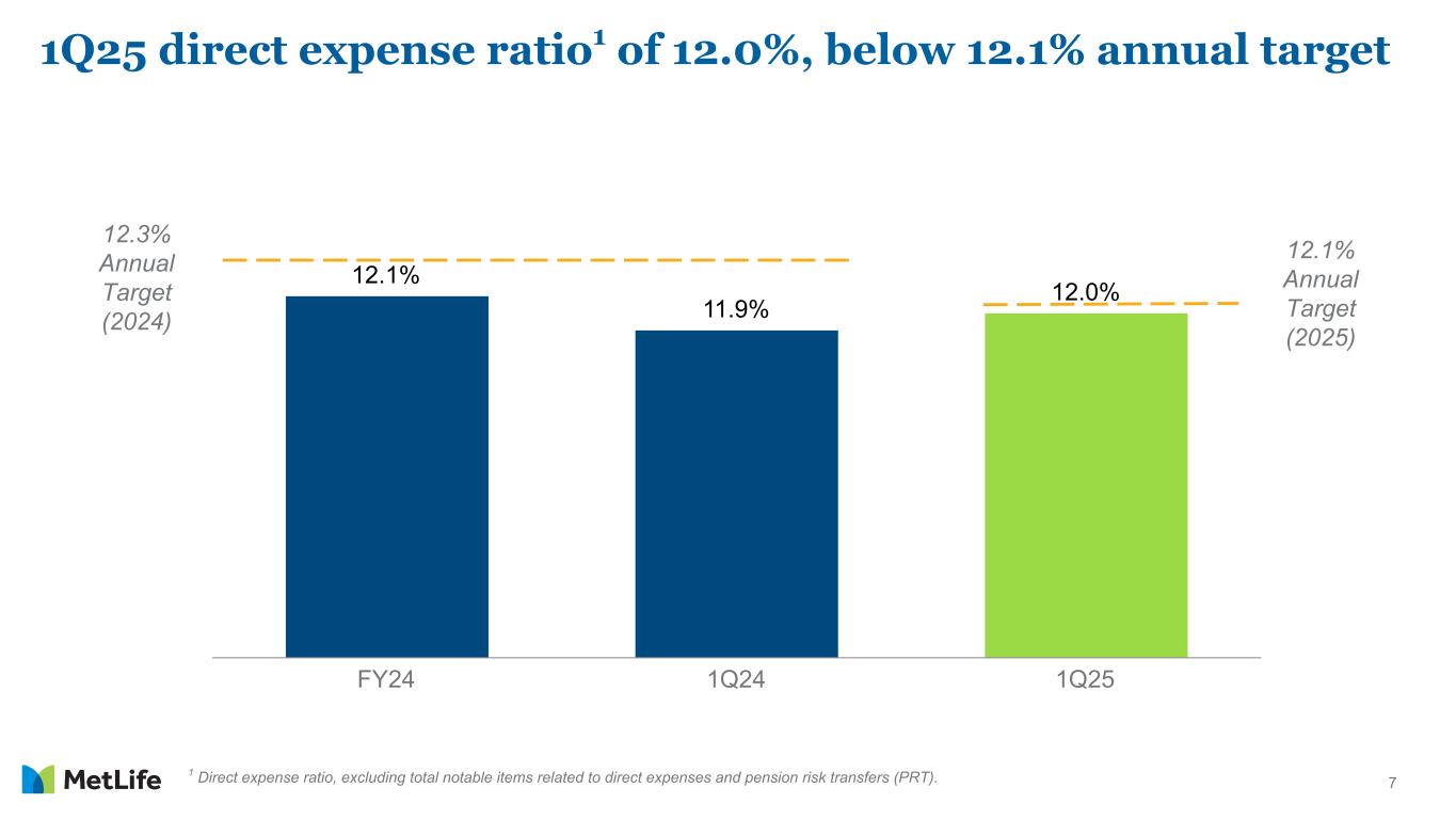 6 1 Assumes a 21% U.S. statutory tax rate. VII by segment and C&O ($ in millions - post-tax1) 1Q24 2Q24 3Q24 4Q24 1Q25 Group Benefits $4 $3 $2 $1 $3 RIS 73 64 50 71 99 Asia 56 99 44 121 94 Latin America 1 2 8 4 3 EMEA — — — — — MetLife Holdings 55 46 29 29 53 Corporate & Other 16 21 (5) 6 6 Total Variable Investment Income $205 $235 $128 $232 $258