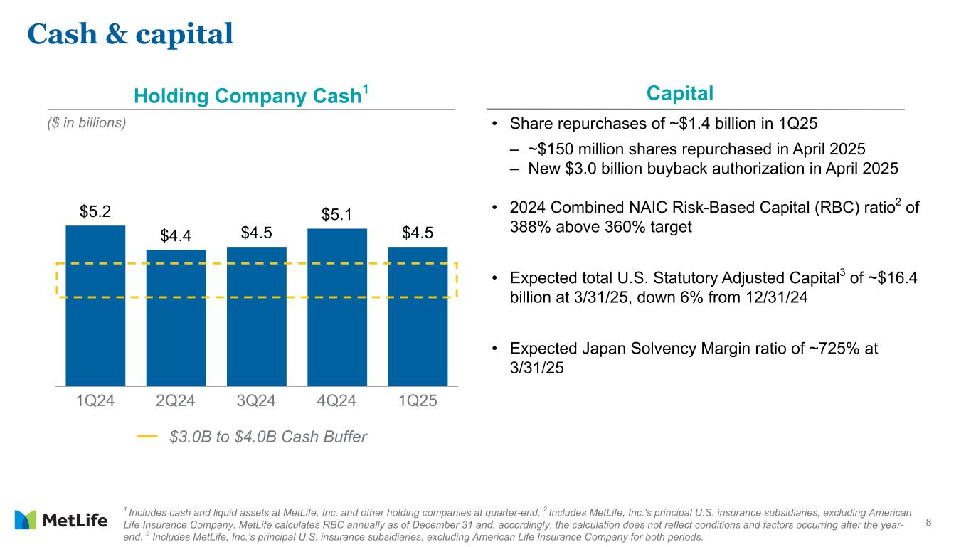 7 12.1% 11.9% 12.0% FY24 1Q24 1Q25 1 Direct expense ratio, excluding total notable items related to direct expenses and pension risk transfers (PRT). 12.1% Annual Target (2025) 1Q25 direct expense ratio1 of 12.0%, below 12.1% annual target 12.3% Annual Target (2024)