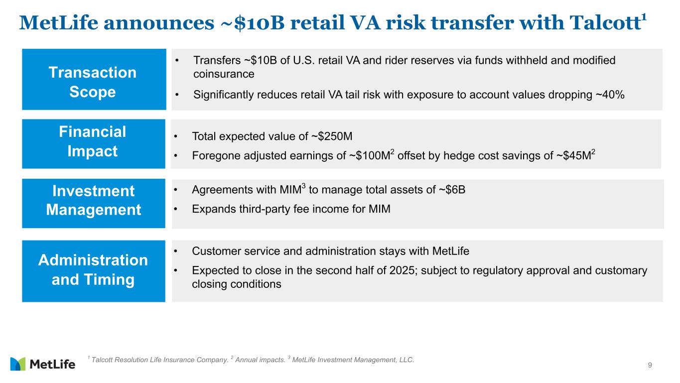8 Holding Company Cash1 $5.2 $4.4 $4.5 $5.1 $4.5 1Q24 2Q24 3Q24 4Q24 1Q25 Cash & capital 1 Includes cash and liquid assets at MetLife, Inc. and other holding companies at quarter-end. 2 Includes MetLife, Inc.'s principal U.S. insurance subsidiaries, excluding American Life Insurance Company. MetLife calculates RBC annually as of December 31 and, accordingly, the calculation does not reflect conditions and factors occurring after the year- end. 3 Includes MetLife, Inc.'s principal U.S. insurance subsidiaries, excluding American Life Insurance Company for both periods. $3.0B to $4.0B Cash Buffer Capital ($ in billions) • Share repurchases of ~$1.4 billion in 1Q25 – ~$150 million shares repurchased in April 2025 – New $3.0 billion buyback authorization in April 2025 • 2024 Combined NAIC Risk-Based Capital (RBC) ratio2 of 388% above 360% target • Expected total U.S. Statutory Adjusted Capital3 of ~$16.4 billion at 3/31/25, down 6% from 12/31/24 • Expected Japan Solvency Margin ratio of ~725% at 3/31/25
