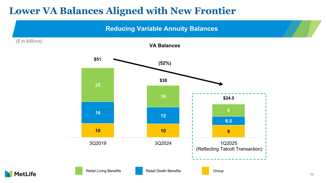 9 MetLife announces ~$10B retail VA risk transfer with Talcott1 1 Talcott Resolution Life Insurance Company. 2 Annual impacts. 3 MetLife Investment Management, LLC. • Transfers ~$10B of U.S. retail VA and rider reserves via funds withheld and modified coinsurance • Significantly reduces retail VA tail risk with exposure to account values dropping ~40% • Total expected value of ~$250M • Foregone adjusted earnings of ~$100M2 offset by hedge cost savings of ~$45M2 • Agreements with MIM3 to manage total assets of ~$6B • Expands third-party fee income for MIM Investment Management Transaction Scope Financial Impact • Customer service and administration stays with MetLife • Expected to close in the second half of 2025; subject to regulatory approval and customary closing conditions Administration and Timing