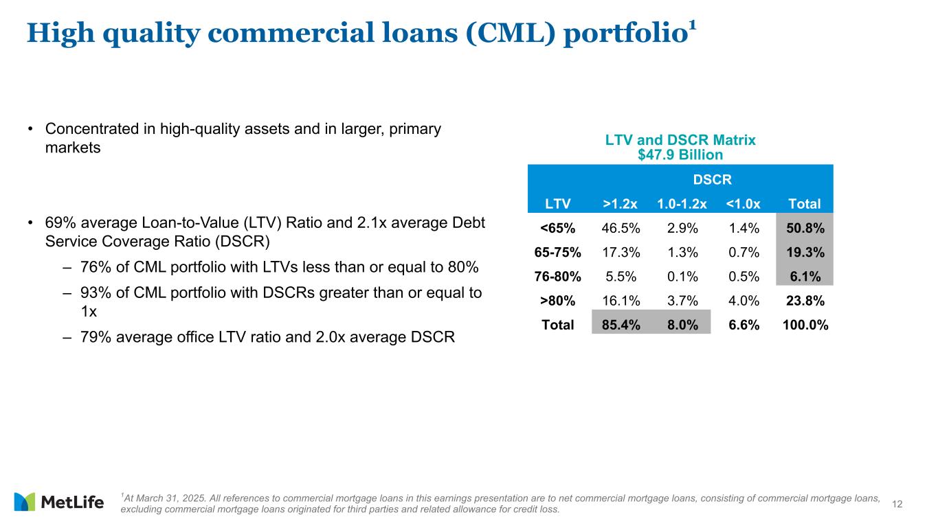12 1At March 31, 2025. All references to commercial mortgage loans in this earnings presentation are to net commercial mortgage loans, consisting of commercial mortgage loans, excluding commercial mortgage loans originated for third parties and related allowance for credit loss. • Concentrated in high-quality assets and in larger, primary markets • 69% average Loan-to-Value (LTV) Ratio and 2.1x average Debt Service Coverage Ratio (DSCR) – 76% of CML portfolio with LTVs less than or equal to 80% – 93% of CML portfolio with DSCRs greater than or equal to 1x – 79% average office LTV ratio and 2.0x average DSCR LTV and DSCR Matrix $47.9 Billion DSCR LTV >1.2x 1.0-1.2x <1.0x Total <65% 46.5% 2.9% 1.4% 50.8% 65-75% 17.3% 1.3% 0.7% 19.3% 76-80% 5.5% 0.1% 0.5% 6.1% >80% 16.1% 3.7% 4.0% 23.8% Total 85.4% 8.0% 6.6% 100.0% High quality commercial loans (CML) portfolio1