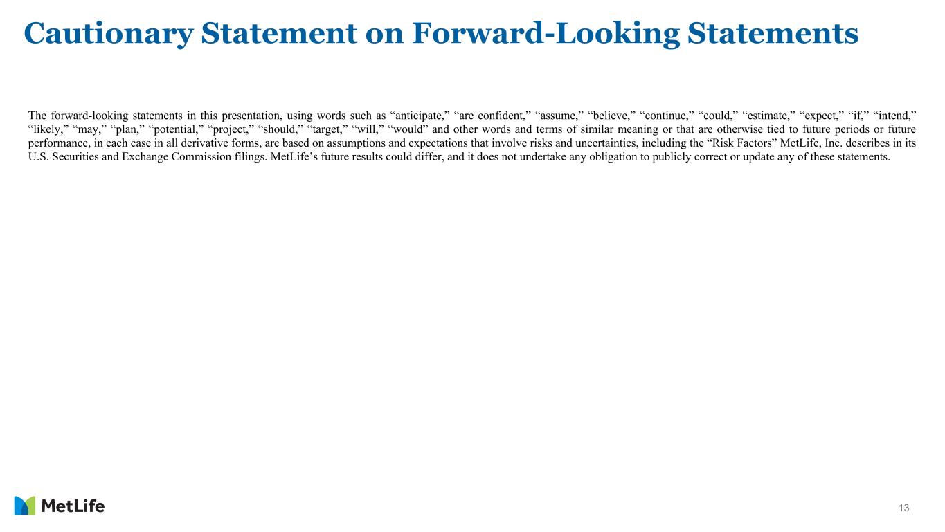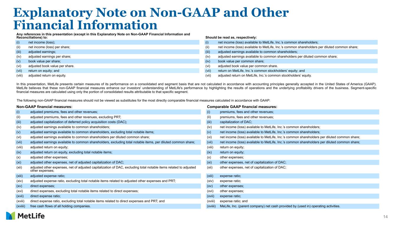 13 Cautionary Statement on Forward-Looking Statements The forward-looking statements in this presentation, using words such as “anticipate,” “are confident,” “assume,” “believe,” “continue,” “could,” “estimate,” “expect,” “if,” “intend,” “likely,” “may,” “plan,” “potential,” “project,” “should,” “target,” “will,” “would” and other words and terms of similar meaning or that are otherwise tied to future periods or future performance, in each case in all derivative forms, are based on assumptions and expectations that involve risks and uncertainties, including the “Risk Factors” MetLife, Inc. describes in its U.S. Securities and Exchange Commission filings. MetLife’s future results could differ, and it does not undertake any obligation to publicly correct or update any of these statements.