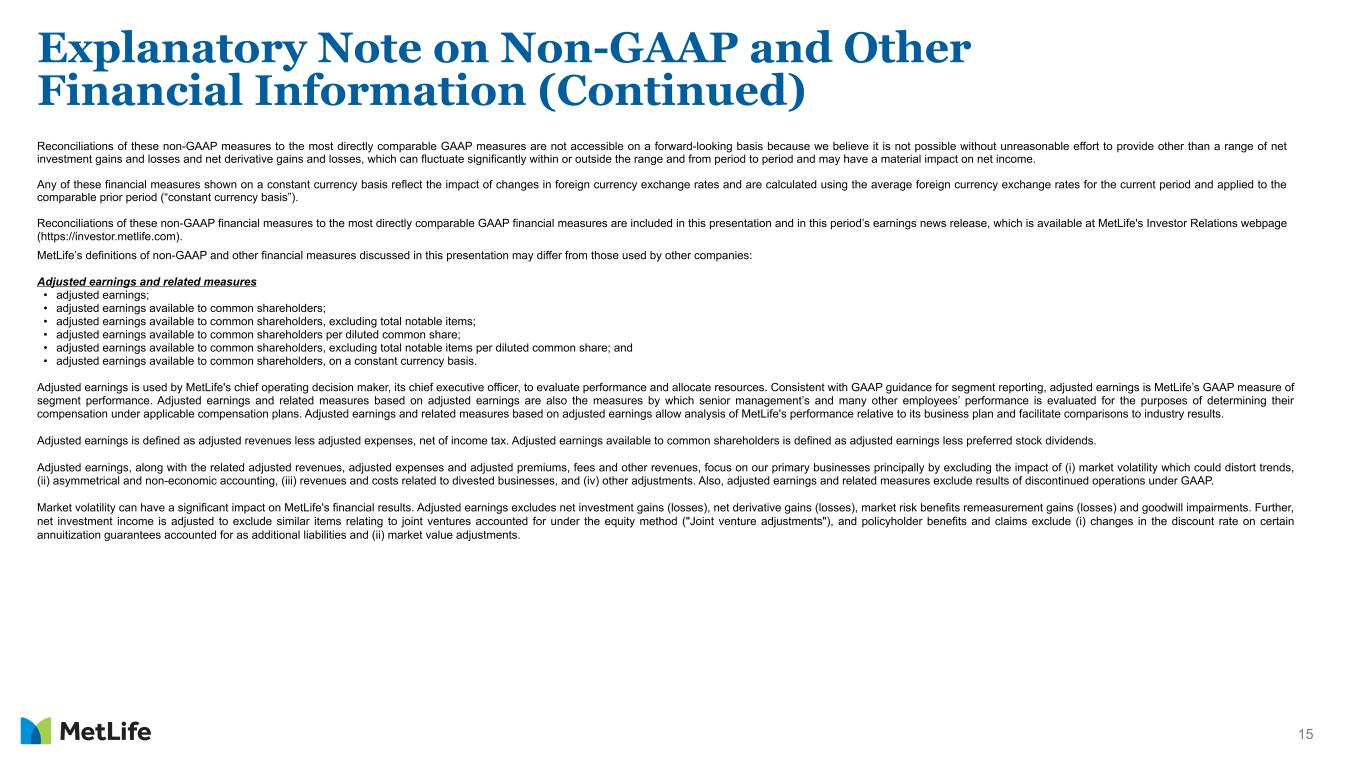 14 Explanatory Note on Non-GAAP and Other Financial Information Any references in this presentation (except in this Explanatory Note on Non-GAAP Financial Information and Reconciliations) to: Should be read as, respectively: (i) net income (loss); (i) net income (loss) available to MetLife, Inc.’s common shareholders; (ii) net income (loss) per share; (ii) net income (loss) available to MetLife, Inc.’s common shareholders per diluted common share; (iii) adjusted earnings; (iii) adjusted earnings available to common shareholders; (iv) adjusted earnings per share; (iv) adjusted earnings available to common shareholders per diluted common share; (v) book value per share; (iv) book value per common share; (vi) adjusted book value per share. (vi) adjusted book value per common share. (vii) return on equity; and (vii) return on MetLife, Inc.’s common stockholders’ equity; and (viii) adjusted return on equity. (vii) adjusted return on MetLife, Inc.’s common stockholders’ equity. In this presentation, MetLife presents certain measures of its performance on a consolidated and segment basis that are not calculated in accordance with accounting principles generally accepted in the United States of America (GAAP). MetLife believes that these non-GAAP financial measures enhance our investors' understanding of MetLife's performance by highlighting the results of operations and the underlying profitability drivers of the business. Segment-specific financial measures are calculated using only the portion of consolidated results attributable to that specific segment. The following non-GAAP financial measures should not be viewed as substitutes for the most directly comparable financial measures calculated in accordance with GAAP: Non-GAAP financial measures: Comparable GAAP financial measures: (i) adjusted premiums, fees and other revenues; (i) premiums, fees and other revenues; (ii) adjusted premiums, fees and other revenues, excluding PRT; (ii) premiums, fees and other revenues; (iii) adjusted capitalization of deferred policy acquisition costs (DAC); (iii) capitalization of DAC; (iv) adjusted earnings available to common shareholders; (iv) net income (loss) available to MetLife, Inc.’s common shareholders; (v) adjusted earnings available to common shareholders, excluding total notable items; (v) net income (loss) available to MetLife, Inc.’s common shareholders; (vi) adjusted earnings available to common shareholders per diluted common share; (vi) net income (loss) available to MetLife, Inc.’s common shareholders per diluted common share; (vii) adjusted earnings available to common shareholders, excluding total notable items, per diluted common share; (vii) net income (loss) available to MetLife, Inc.’s common shareholders per diluted common share; (viii) adjusted return on equity; (viii) return on equity; (ix) adjusted return on equity, excluding total notable items; (ix) return on equity; (x) adjusted other expenses; (x) other expenses; (xi) adjusted other expenses, net of adjusted capitalization of DAC; (xi) other expenses, net of capitalization of DAC; (xii) adjusted other expenses, net of adjusted capitalization of DAC, excluding total notable items related to adjusted other expenses; (xii) other expenses, net of capitalization of DAC; (xiii) adjusted expense ratio; (xiii) expense ratio; (xiv) adjusted expense ratio, excluding total notable items related to adjusted other expenses and PRT; (xiv) expense ratio; (xv) direct expenses; (xv) other expenses; (xvi) direct expenses, excluding total notable items related to direct expenses; (xvi) other expenses; (xvii) direct expense ratio; (xvii) expense ratio; (xviii) direct expense ratio, excluding total notable items related to direct expenses and PRT; and (xviii) expense ratio; and (xviiii) free cash flows of all holding companies. (xviiii) MeLife, Inc. (parent company) net cash provided by (used in) operating activities.