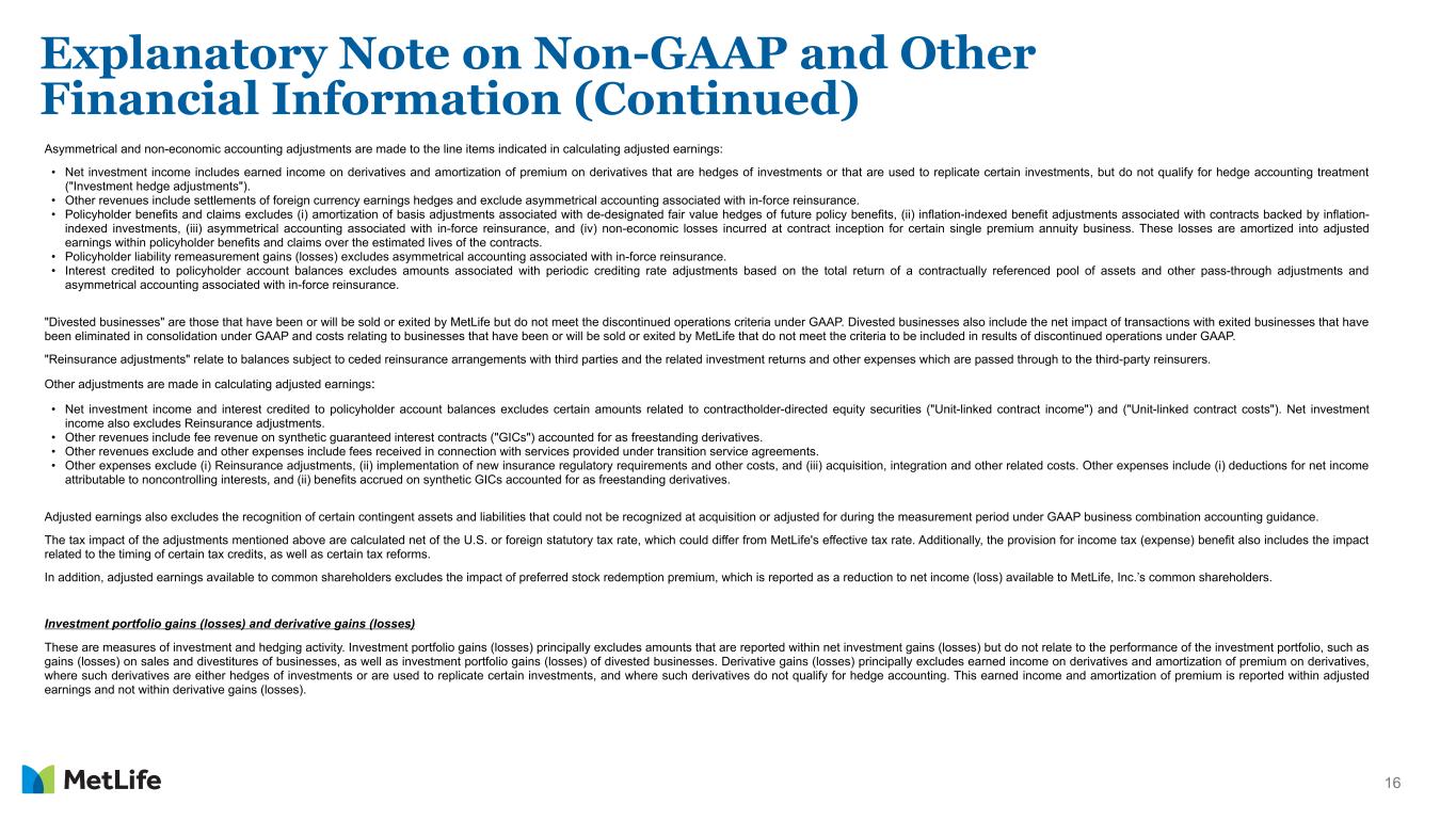 15 MetLife’s definitions of non-GAAP and other financial measures discussed in this presentation may differ from those used by other companies: Adjusted earnings and related measures • adjusted earnings; • adjusted earnings available to common shareholders; • adjusted earnings available to common shareholders, excluding total notable items; • adjusted earnings available to common shareholders per diluted common share; • adjusted earnings available to common shareholders, excluding total notable items per diluted common share; and • adjusted earnings available to common shareholders, on a constant currency basis. Adjusted earnings is used by MetLife's chief operating decision maker, its chief executive officer, to evaluate performance and allocate resources. Consistent with GAAP guidance for segment reporting, adjusted earnings is MetLife’s GAAP measure of segment performance. Adjusted earnings and related measures based on adjusted earnings are also the measures by which senior management’s and many other employees’ performance is evaluated for the purposes of determining their compensation under applicable compensation plans. Adjusted earnings and related measures based on adjusted earnings allow analysis of MetLife's performance relative to its business plan and facilitate comparisons to industry results. Adjusted earnings is defined as adjusted revenues less adjusted expenses, net of income tax. Adjusted earnings available to common shareholders is defined as adjusted earnings less preferred stock dividends. Adjusted earnings, along with the related adjusted revenues, adjusted expenses and adjusted premiums, fees and other revenues, focus on our primary businesses principally by excluding the impact of (i) market volatility which could distort trends, (ii) asymmetrical and non-economic accounting, (iii) revenues and costs related to divested businesses, and (iv) other adjustments. Also, adjusted earnings and related measures exclude results of discontinued operations under GAAP. Market volatility can have a significant impact on MetLife's financial results. Adjusted earnings excludes net investment gains (losses), net derivative gains (losses), market risk benefits remeasurement gains (losses) and goodwill impairments. Further, net investment income is adjusted to exclude similar items relating to joint ventures accounted for under the equity method ("Joint venture adjustments"), and policyholder benefits and claims exclude (i) changes in the discount rate on certain annuitization guarantees accounted for as additional liabilities and (ii) market value adjustments. Explanatory Note on Non-GAAP and Other Financial Information (Continued) Reconciliations of these non-GAAP measures to the most directly comparable GAAP measures are not accessible on a forward-looking basis because we believe it is not possible without unreasonable effort to provide other than a range of net investment gains and losses and net derivative gains and losses, which can fluctuate significantly within or outside the range and from period to period and may have a material impact on net income. Any of these financial measures shown on a constant currency basis reflect the impact of changes in foreign currency exchange rates and are calculated using the average foreign currency exchange rates for the current period and applied to the comparable prior period (“constant currency basis”). Reconciliations of these non-GAAP financial measures to the most directly comparable GAAP financial measures are included in this presentation and in this period’s earnings news release, which is available at MetLife's Investor Relations webpage (https://investor.metlife.com).