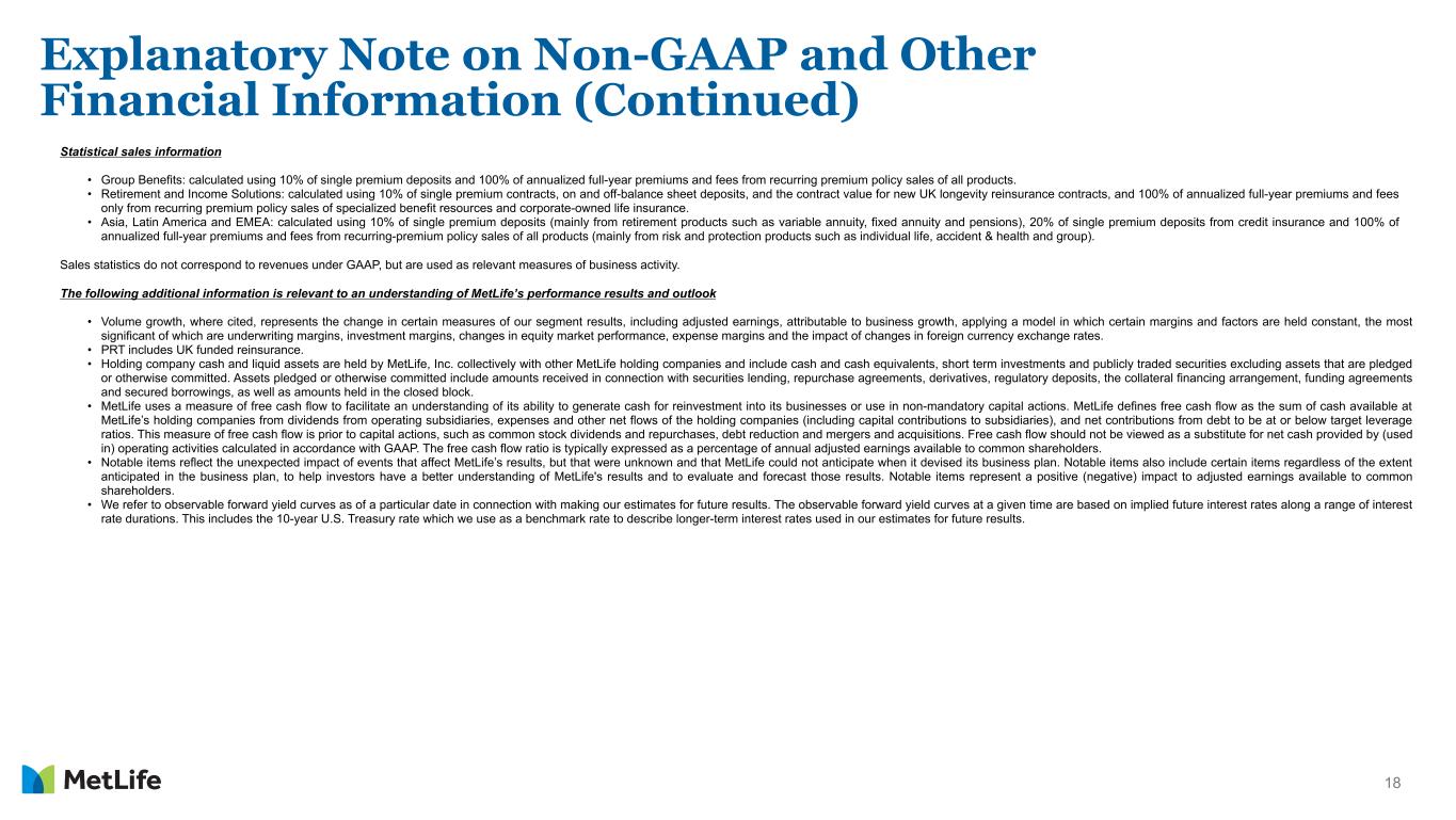 17 Explanatory Note on Non-GAAP and Other Financial Information (Continued) Return on equity and related measures • Total MetLife, Inc.’s adjusted common stockholders’ equity: total MetLife, Inc.’s common stockholders’ equity, excluding unrealized investment gains (losses), net of related offsets, deferred gains (losses) on derivatives, future policy benefits discount rate remeasurement gains (losses), market risk benefits instrument-specific credit risk remeasurement gains (losses) and defined benefit plans adjustment components of AOCI and the estimated fair value of certain ceded reinsurance-related embedded derivatives (see "Reinsurance adjustments"), all net of income tax. • Total MetLife, Inc.’s adjusted common stockholders’ equity, excluding total notable items: total MetLife, Inc.’s common stockholders’ equity, excluding unrealized investment gains (losses), net of related offsets, deferred gains (losses) on derivatives, future policy benefits discount rate remeasurement gains (losses), market risk benefits instrument-specific credit risk remeasurement gains (losses) and defined benefit plans adjustment components of AOCI, the estimated fair value of certain ceded reinsurance-related embedded derivatives (see "Reinsurance adjustments") and total notable items, all net of income tax. • Return on MetLife, Inc.’s common stockholders’ equity: net income (loss) available to MetLife, Inc.’s common shareholders divided by MetLife, Inc.'s average common stockholders’ equity. • Adjusted return on MetLife, Inc.’s common stockholders’ equity: adjusted earnings available to common shareholders divided by MetLife, Inc.'s average adjusted common stockholders’ equity. • Adjusted return on MetLife, Inc.’s common stockholders’ equity, excluding total notable items: adjusted earnings available to common shareholders, excluding total notable items, divided by MetLife, Inc.'s average adjusted common stockholders’ equity, excluding total notable items. The above measures represent a level of equity that excludes most components of AOCI, such as unrealized investment gains (losses), net of related offsets, and future policy benefits discount rate remeasurement gains (losses), as well as the impact of certain ceded reinsurance-related embedded derivatives (see "Reinsurance adjustments"), as these amounts are primarily driven by market volatility. Expense ratio, direct expense ratio, adjusted expense ratio and related measures • Expense ratio: other expenses, net of capitalization of DAC, divided by premiums, fees and other revenues. • Direct expense ratio: adjusted direct expenses, divided by adjusted premiums, fees and other revenues. Direct expenses are comprised of employee-related costs, third-party staffing costs, and general and administrative expenses. • Direct expense ratio, excluding total notable items related to direct expenses and PRT: adjusted direct expenses, excluding total notable items related to direct expenses, divided by adjusted premiums, fees and other revenues, excluding PRT. • Adjusted expense ratio: adjusted other expenses, net of adjusted capitalization of DAC, divided by adjusted premiums, fees and other revenues. • Adjusted expense ratio, excluding total notable items related to adjusted other expenses and PRT: adjusted other expenses, net of adjusted capitalization of DAC, excluding total notable items related to adjusted other expenses, divided by adjusted premiums, fees and other revenues, excluding PRT. General Account (GA) assets under management (GA AUM) GA AUM is used by MetLife to describe assets in its GA investment portfolio. GA AUM is stated at estimated fair value and is comprised of GA total investments, the portion of the GA investment portfolio classified within assets held-for-sale, cash and cash equivalents and accrued investment income on such assets, excluding policy loans, contractholder-directed equity securities fair value option securities, mortgage loans originated for third parties, assets subject to ceded reinsurance arrangements with third-party reinsurers, and certain other invested assets. Mortgage loans, net of mortgage loans originated for third parties (“net mortgage loans”) (including commercial (“net commercial mortgage loans”), agricultural ("net agricultural mortgage loans") and residential mortgage loans) and real estate equity (including real estate and real estate joint ventures) included in GA AUM (at net asset value, net of deduction for encumbering debt) have been adjusted from carrying value to estimated fair value. Classification of GA AUM by sector is based on the nature and characteristics of the underlying investments which can vary from how they are classified under GAAP. Accordingly, the underlying investments within certain real estate and real estate joint ventures that are primarily net commercial mortgage loans (at net asset value, net of deduction for encumbering debt) have been reclassified to exclude them from real estate equity and include them as net commercial mortgage loans. Asia GA AUM and related measures Asia GA AUM is used by MetLife to describe assets in its Asia GA investment portfolio. Asia GA AUM is stated at estimated fair value and is comprised of Asia GA total investments, the portion of the Asia GA investment portfolio classified within assets held-for-sale, cash and cash equivalents, and accrued investment income on such assets, excluding policy loans, contractholder-directed equity securities, fair value option securities, mortgage loans originated for third parties, assets subject to ceded reinsurance arrangements with third-party reinsurers, and certain other invested assets. Mortgage loans, net of mortgage loans originated for third parties ("net mortgage loans") (including commercial ("net commercial mortgage loans"), agricultural ("net agricultural mortgage loans") and residential mortgage loans) and real estate equity (including real