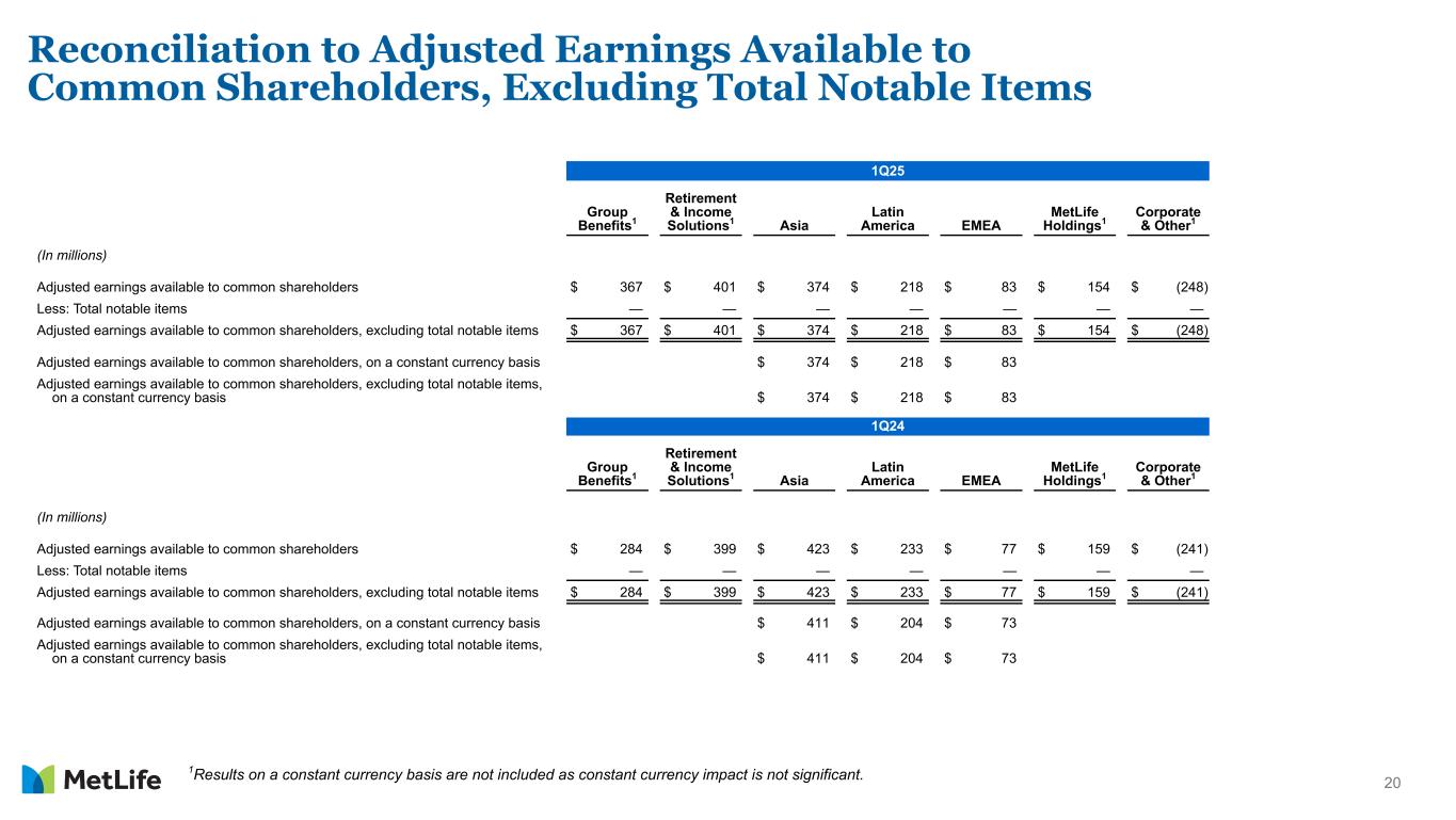 19 Reconciliation of Net Income (Loss) Available to MetLife, Inc.’s Common Shareholders to Adjusted Earnings Available to Common Shareholders 1Q25 1Q24 Earnings Per Weighted Average Common Share Diluted1 Earnings Per Weighted Average Common Share Diluted1 (In millions, except per share data) Net Income (loss) available to MetLife, Inc.'s common shareholders $ 879 $ 1.28 $ 800 $ 1.10 Adjustments from net income (loss) available to MetLife, Inc.'s common shareholders to adjusted earnings available to common shareholders: Less: Net investment gains (losses) (387) (0.56) (375) (0.51) Less: Net derivative gains (losses) 432 0.63 (979) (1.34) Less: Market risk benefit remeasurement gains (losses) (299) (0.44) 694 0.95 Less: Other adjustments to net income (loss) (234) (0.33) (126) (0.18) Less: Provision for income tax (expense) benefit 23 0.03 260 0.36 Add: Net income (loss) attributable to noncontrolling interests 5 0.01 8 0.01 Adjusted earnings available to common shareholders 1,349 1.96 1,334 1.83 Less: Total notable items — — — — Adjusted earnings available to common shareholders, excluding total notable items $ 1,349 $ 1.96 $ 1,334 $ 1.83 Adjusted earnings available to common shareholders, on a constant currency basis $ 1,349 $ 1.96 $ 1,289 $ 1.77 Adjusted earnings available to common shareholders, excluding total notable items, on a $ 1,349 $ 1.96 $ 1,289 $ 1.77 constant currency basis Weighted average common shares outstanding - diluted 687.0 728.4 1Adjusted earnings available to common shareholders, excluding total notable items, per diluted common share is calculated on a standalone basis and may not equal (i) adjusted earnings available to common shareholders per diluted common share, less (ii) total notable items per diluted common share.