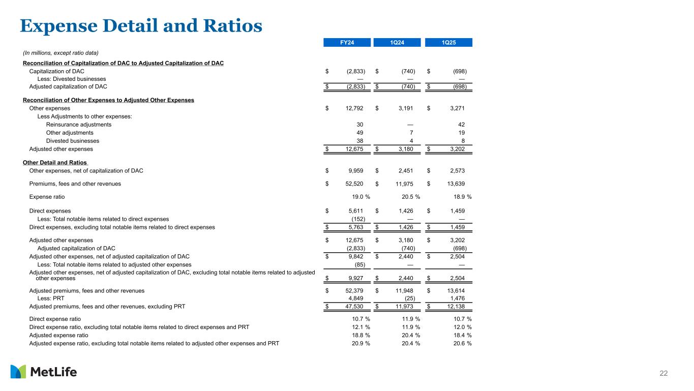 21 Reconciliation of Premiums, Fees and Other Revenues to Adjusted Premiums, Fees and Other Revenues FY24 1Q24 1Q25 (In millions) Premiums, fees and other revenues $ 52,520 $ 11,975 $ 13,639 Less: Adjustments to premiums, fees and other revenues: Asymmetrical and non-economic accounting 158 39 36 Other adjustments (48) (12) (15) Divested businesses 31 — 4 Adjusted premiums, fees and other revenues $ 52,379 $ 11,948 $ 13,614