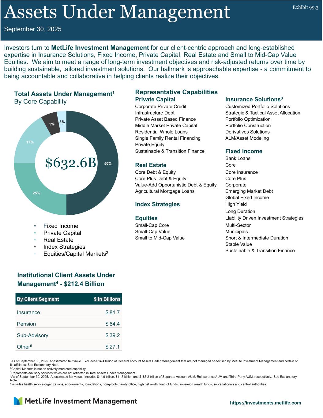 Investors turn to MetLife Investment Management for our client-centric approach and long-established expertise in Insurance Solutions, Fixed Income, Private Capital, Real Estate and Small to Mid-Cap Value Equities. We aim to meet a range of long-term investment objectives and risk-adjusted returns over time by building sustainable, tailored investment solutions. Our hallmark is approachable expertise - a commitment to being accountable and collaborative in helping clients realize their objectives. By Client Segment $ in Billions Insurance $ 81.7 Pension $ 64.4 Sub-Advisory $ 39.2 Other5 $ 27.1 1As of September 30, 2025. At estimated fair value. Excludes $14.4 billion of General Account Assets Under Management that are not managed or advised by MetLife Investment Management and certain of its affiliates. See Explanatory Note. 2Capital Markets is not an actively marketed capability. 3Represents advisory services which are not reflected in Total Assets Under Management. 4As of September 30, 2025. At estimated fair value. Includes $14.9 billion, $11.3 billion and $186.2 billion of Separate Account AUM, Reinsurance AUM and Third-Party AUM, respectively. See Explanatory Note. 5Includes health service organizations, endowments, foundations, non-profits, family office, high net worth, fund of funds, sovereign wealth funds, supranationals and central authorities. Representative Capabilities Private Capital Insurance Solutions3 Corporate Private Credit Customized Portfolio Solutions Infrastructure Debt Strategic & Tactical Asset Allocation Private Asset Based Finance Portfolio Optimization Middle Market Private Capital Portfolio Construction Residential Whole Loans Derivatives Solutions Single Family Rental Financing ALM/Asset Modeling Private Equity Sustainable & Transition Finance Fixed Income Bank Loans Real Estate Core Core Debt & Equity Core Insurance Core Plus Debt & Equity Core Plus Value-Add Opportunistic Debt & Equity Corporate Agricultural Mortgage Loans Emerging Market Debt Global Fixed Income Index Strategies High Yield Long Duration Equities Liability Driven Investment Strategies Small-Cap Core Multi-Sector Small-Cap Value Municipals Small to Mid-Cap Value Short & Intermediate Duration Stable Value Sustainable & Transition Finance Institutional Client Assets Under Management4 - $212.4 Billion https://investments.metlife.com $632.6B 50% 25% 17% 5% 3% Total Assets Under Management1 By Core Capability Assets Under Management September 30, 2025 Exhibit 99.3 • Fixed Income • Private Capital • Real Estate • Index Strategies • Equities/Capital Markets2