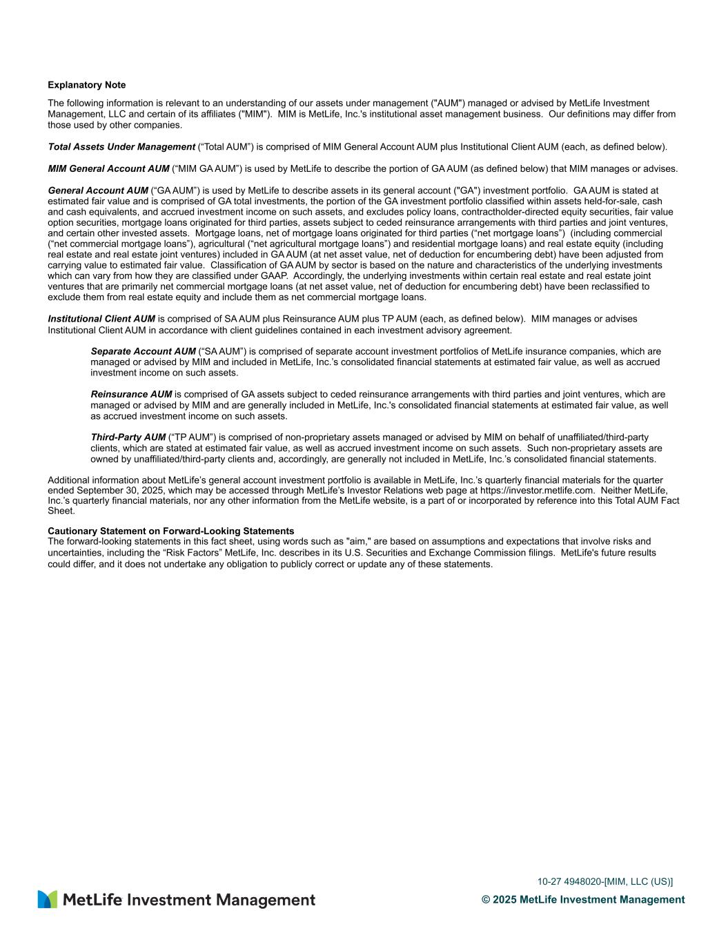 Explanatory Note The following information is relevant to an understanding of our assets under management ("AUM") managed or advised by MetLife Investment Management, LLC and certain of its affiliates ("MIM"). MIM is MetLife, Inc.'s institutional asset management business. Our definitions may differ from those used by other companies. Total Assets Under Management (“Total AUM”) is comprised of MIM General Account AUM plus Institutional Client AUM (each, as defined below). MIM General Account AUM (“MIM GA AUM”) is used by MetLife to describe the portion of GA AUM (as defined below) that MIM manages or advises. General Account AUM (“GA AUM”) is used by MetLife to describe assets in its general account ("GA") investment portfolio. GA AUM is stated at estimated fair value and is comprised of GA total investments, the portion of the GA investment portfolio classified within assets held-for-sale, cash and cash equivalents, and accrued investment income on such assets, and excludes policy loans, contractholder-directed equity securities, fair value option securities, mortgage loans originated for third parties, assets subject to ceded reinsurance arrangements with third parties and joint ventures, and certain other invested assets. Mortgage loans, net of mortgage loans originated for third parties (“net mortgage loans”) (including commercial (“net commercial mortgage loans”), agricultural (“net agricultural mortgage loans”) and residential mortgage loans) and real estate equity (including real estate and real estate joint ventures) included in GA AUM (at net asset value, net of deduction for encumbering debt) have been adjusted from carrying value to estimated fair value. Classification of GA AUM by sector is based on the nature and characteristics of the underlying investments which can vary from how they are classified under GAAP. Accordingly, the underlying investments within certain real estate and real estate joint ventures that are primarily net commercial mortgage loans (at net asset value, net of deduction for encumbering debt) have been reclassified to exclude them from real estate equity and include them as net commercial mortgage loans. Institutional Client AUM is comprised of SA AUM plus Reinsurance AUM plus TP AUM (each, as defined below). MIM manages or advises Institutional Client AUM in accordance with client guidelines contained in each investment advisory agreement. Separate Account AUM (“SA AUM”) is comprised of separate account investment portfolios of MetLife insurance companies, which are managed or advised by MIM and included in MetLife, Inc.’s consolidated financial statements at estimated fair value, as well as accrued investment income on such assets. Reinsurance AUM is comprised of GA assets subject to ceded reinsurance arrangements with third parties and joint ventures, which are managed or advised by MIM and are generally included in MetLife, Inc.'s consolidated financial statements at estimated fair value, as well as accrued investment income on such assets. Third-Party AUM (“TP AUM”) is comprised of non-proprietary assets managed or advised by MIM on behalf of unaffiliated/third-party clients, which are stated at estimated fair value, as well as accrued investment income on such assets. Such non-proprietary assets are owned by unaffiliated/third-party clients and, accordingly, are generally not included in MetLife, Inc.’s consolidated financial statements. Additional information about MetLife’s general account investment portfolio is available in MetLife, Inc.’s quarterly financial materials for the quarter ended September 30, 2025, which may be accessed through MetLife’s Investor Relations web page at https://investor.metlife.com. Neither MetLife, Inc.’s quarterly financial materials, nor any other information from the MetLife website, is a part of or incorporated by reference into this Total AUM Fact Sheet. Cautionary Statement on Forward-Looking Statements The forward-looking statements in this fact sheet, using words such as "aim," are based on assumptions and expectations that involve risks and uncertainties, including the “Risk Factors” MetLife, Inc. describes in its U.S. Securities and Exchange Commission filings. MetLife's future results could differ, and it does not undertake any obligation to publicly correct or update any of these statements. 10-27 4948020-[MIM, LLC (US)] © 2025 MetLife Investment Management