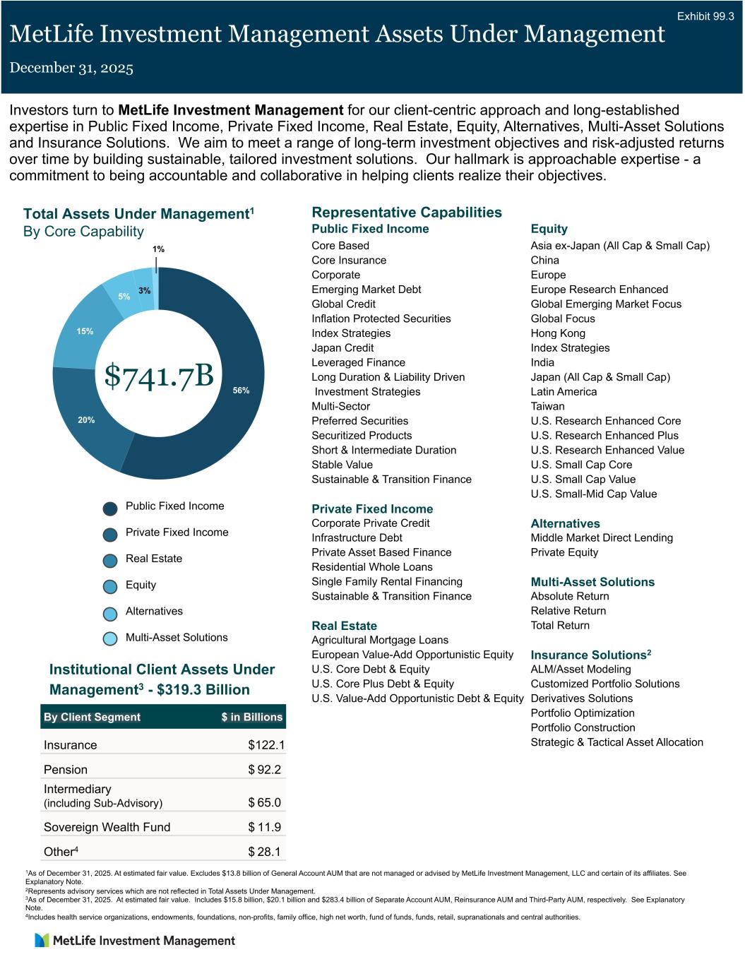 Investors turn to MetLife Investment Management for our client-centric approach and long-established expertise in Public Fixed Income, Private Fixed Income, Real Estate, Equity, Alternatives, Multi-Asset Solutions and Insurance Solutions. We aim to meet a range of long-term investment objectives and risk-adjusted returns over time by building sustainable, tailored investment solutions. Our hallmark is approachable expertise - a commitment to being accountable and collaborative in helping clients realize their objectives. By Client Segment $ in Billions Insurance $ 122.1 Pension $ 92.2 Intermediary (including Sub-Advisory) $ 65.0 Sovereign Wealth Fund $ 11.9 Other4 $ 28.1 1As of December 31, 2025. At estimated fair value. Excludes $13.8 billion of General Account AUM that are not managed or advised by MetLife Investment Management, LLC and certain of its affiliates. See Explanatory Note. 2Represents advisory services which are not reflected in Total Assets Under Management. 3As of December 31, 2025. At estimated fair value. Includes $15.8 billion, $20.1 billion and $283.4 billion of Separate Account AUM, Reinsurance AUM and Third-Party AUM, respectively. See Explanatory Note. 4Includes health service organizations, endowments, foundations, non-profits, family office, high net worth, fund of funds, funds, retail, supranationals and central authorities. Representative Capabilities Public Fixed Income Equity Core Based Asia ex-Japan (All Cap & Small Cap) Core Insurance China Corporate Europe Emerging Market Debt Europe Research Enhanced Global Credit Global Emerging Market Focus Inflation Protected Securities Global Focus Index Strategies Hong Kong Japan Credit Index Strategies Leveraged Finance India Long Duration & Liability Driven Japan (All Cap & Small Cap) Investment Strategies Latin America Multi-Sector Taiwan Preferred Securities U.S. Research Enhanced Core Securitized Products U.S. Research Enhanced Plus Short & Intermediate Duration U.S. Research Enhanced Value Stable Value U.S. Small Cap Core Sustainable & Transition Finance U.S. Small Cap Value U.S. Small-Mid Cap Value Private Fixed Income Corporate Private Credit Alternatives Infrastructure Debt Middle Market Direct Lending Private Asset Based Finance Private Equity Residential Whole Loans Single Family Rental Financing Multi-Asset Solutions Sustainable & Transition Finance Absolute Return Relative Return Real Estate Total Return Agricultural Mortgage Loans European Value-Add Opportunistic Equity Insurance Solutions2 U.S. Core Debt & Equity ALM/Asset Modeling U.S. Core Plus Debt & Equity Customized Portfolio Solutions U.S. Value-Add Opportunistic Debt & Equity Derivatives Solutions Portfolio Optimization Portfolio Construction Strategic & Tactical Asset Allocation Institutional Client Assets Under Management3 - $319.3 Billion $741.7B 56% 20% 15% 5% 3% Total Assets Under Management1 By Core Capability MetLife Investment Management Assets Under Management December 31, 2025 Exhibit 99.3 Public Fixed Income Private Fixed Income Real Estate Equity Alternatives Multi-Asset Solutions 1%