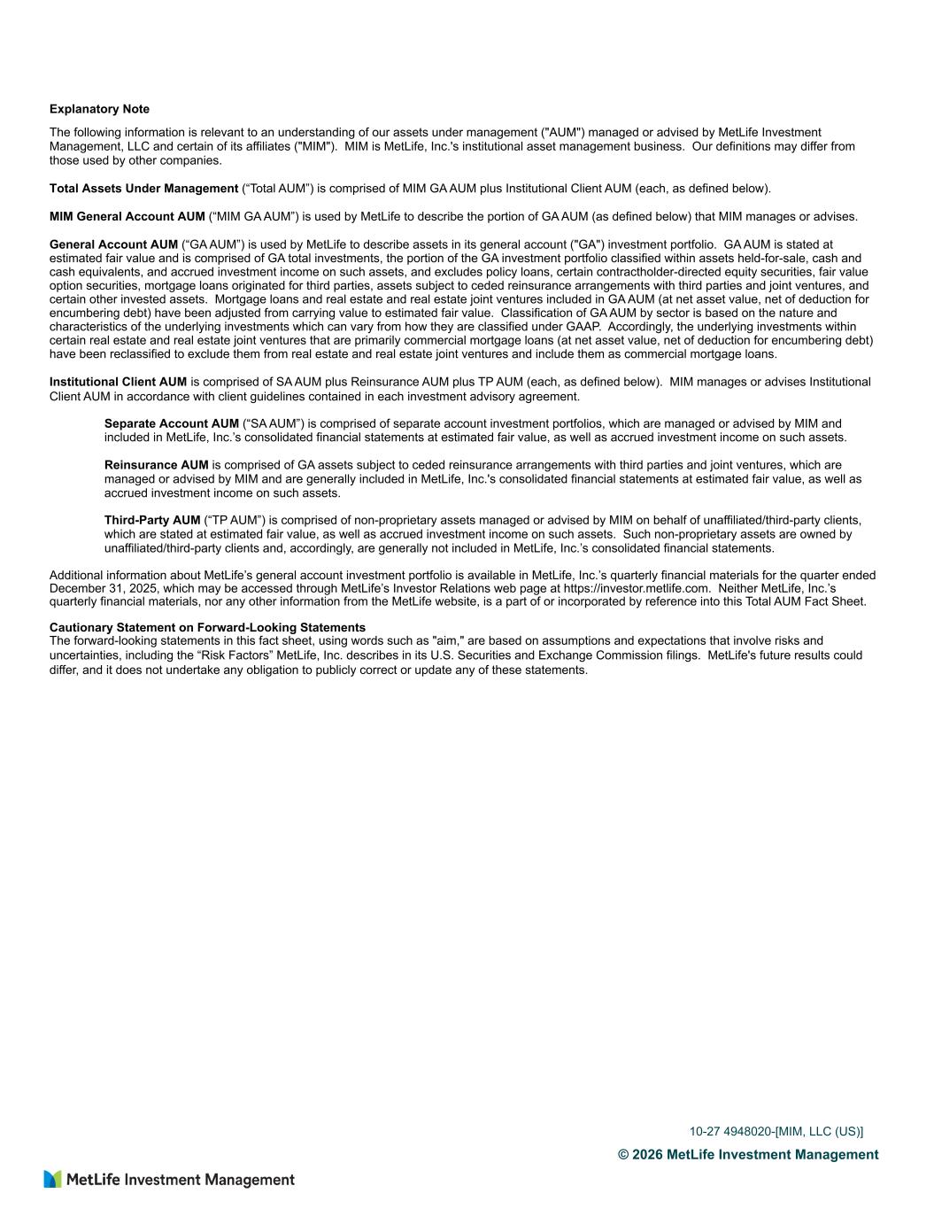 Explanatory Note The following information is relevant to an understanding of our assets under management ("AUM") managed or advised by MetLife Investment Management, LLC and certain of its affiliates ("MIM"). MIM is MetLife, Inc.'s institutional asset management business. Our definitions may differ from those used by other companies. Total Assets Under Management (“Total AUM”) is comprised of MIM GA AUM plus Institutional Client AUM (each, as defined below). MIM General Account AUM (“MIM GA AUM”) is used by MetLife to describe the portion of GA AUM (as defined below) that MIM manages or advises. General Account AUM (“GA AUM”) is used by MetLife to describe assets in its general account ("GA") investment portfolio. GA AUM is stated at estimated fair value and is comprised of GA total investments, the portion of the GA investment portfolio classified within assets held-for-sale, cash and cash equivalents, and accrued investment income on such assets, and excludes policy loans, certain contractholder-directed equity securities, fair value option securities, mortgage loans originated for third parties, assets subject to ceded reinsurance arrangements with third parties and joint ventures, and certain other invested assets. Mortgage loans and real estate and real estate joint ventures included in GA AUM (at net asset value, net of deduction for encumbering debt) have been adjusted from carrying value to estimated fair value. Classification of GA AUM by sector is based on the nature and characteristics of the underlying investments which can vary from how they are classified under GAAP. Accordingly, the underlying investments within certain real estate and real estate joint ventures that are primarily commercial mortgage loans (at net asset value, net of deduction for encumbering debt) have been reclassified to exclude them from real estate and real estate joint ventures and include them as commercial mortgage loans. Institutional Client AUM is comprised of SA AUM plus Reinsurance AUM plus TP AUM (each, as defined below). MIM manages or advises Institutional Client AUM in accordance with client guidelines contained in each investment advisory agreement. Separate Account AUM (“SA AUM”) is comprised of separate account investment portfolios, which are managed or advised by MIM and included in MetLife, Inc.’s consolidated financial statements at estimated fair value, as well as accrued investment income on such assets. Reinsurance AUM is comprised of GA assets subject to ceded reinsurance arrangements with third parties and joint ventures, which are managed or advised by MIM and are generally included in MetLife, Inc.'s consolidated financial statements at estimated fair value, as well as accrued investment income on such assets. Third-Party AUM (“TP AUM”) is comprised of non-proprietary assets managed or advised by MIM on behalf of unaffiliated/third-party clients, which are stated at estimated fair value, as well as accrued investment income on such assets. Such non-proprietary assets are owned by unaffiliated/third-party clients and, accordingly, are generally not included in MetLife, Inc.’s consolidated financial statements. Additional information about MetLife’s general account investment portfolio is available in MetLife, Inc.’s quarterly financial materials for the quarter ended December 31, 2025, which may be accessed through MetLife’s Investor Relations web page at https://investor.metlife.com. Neither MetLife, Inc.’s quarterly financial materials, nor any other information from the MetLife website, is a part of or incorporated by reference into this Total AUM Fact Sheet. Cautionary Statement on Forward-Looking Statements The forward-looking statements in this fact sheet, using words such as "aim," are based on assumptions and expectations that involve risks and uncertainties, including the “Risk Factors” MetLife, Inc. describes in its U.S. Securities and Exchange Commission filings. MetLife's future results could differ, and it does not undertake any obligation to publicly correct or update any of these statements. 10-27 4948020-[MIM, LLC (US)] © 2026 MetLife Investment Management