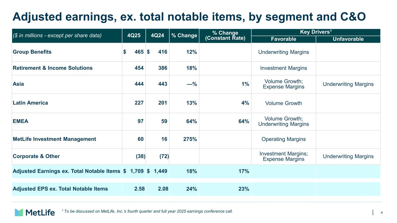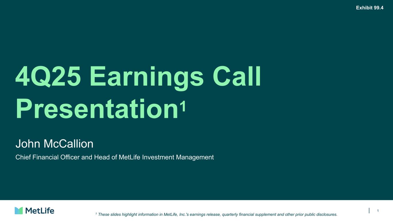 1 4Q25 Earnings Call Presentation1 John McCallion Chief Financial Officer and Head of MetLife Investment Management 1 These slides highlight information in MetLife, Inc.'s earnings release, quarterly financial supplement and other prior public disclosures. Exhibit 99.4 1 These slides highlight information in MetLife, Inc.'s earnings release, quarterly financial supplement and other prior public disclosures.