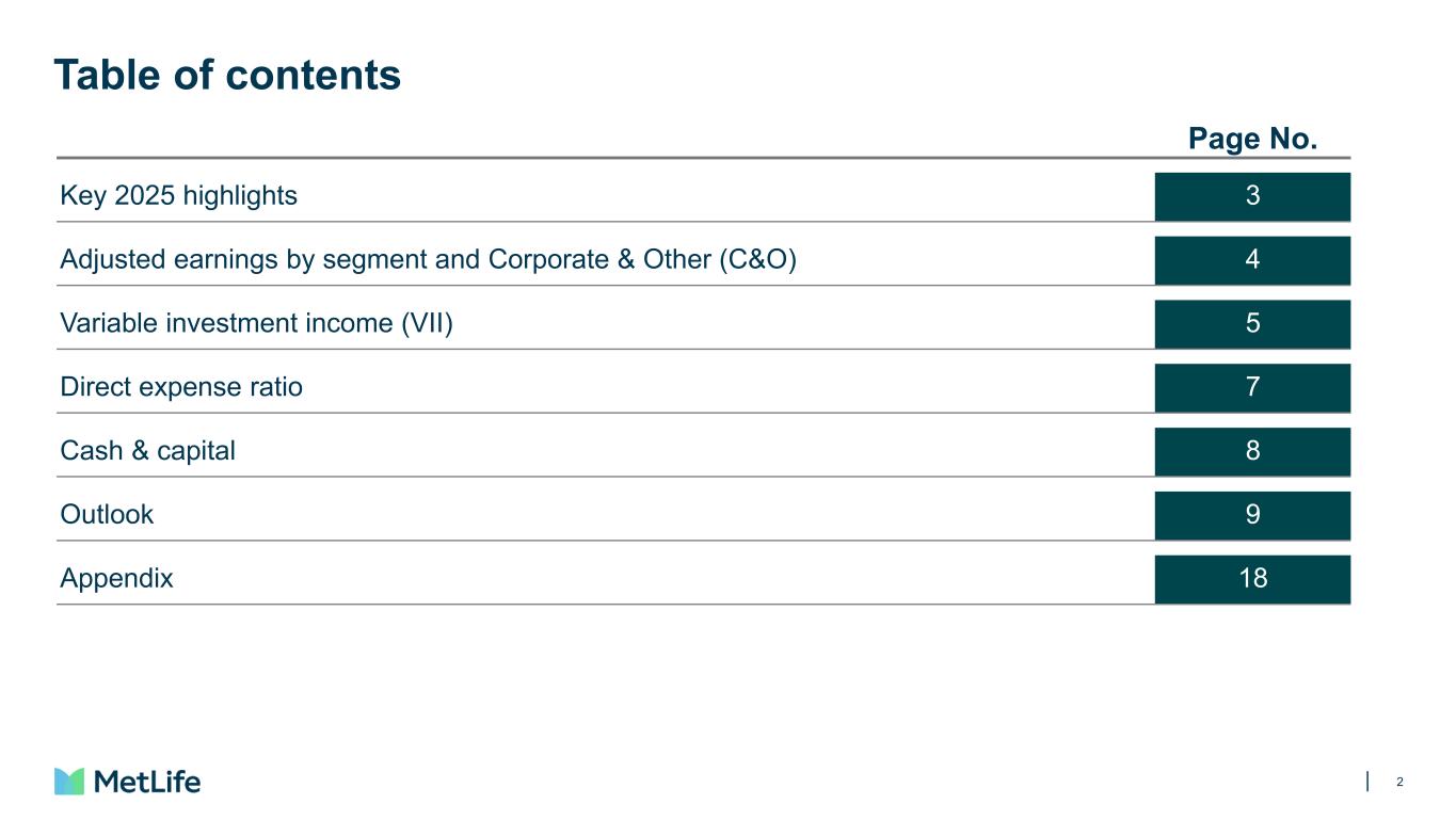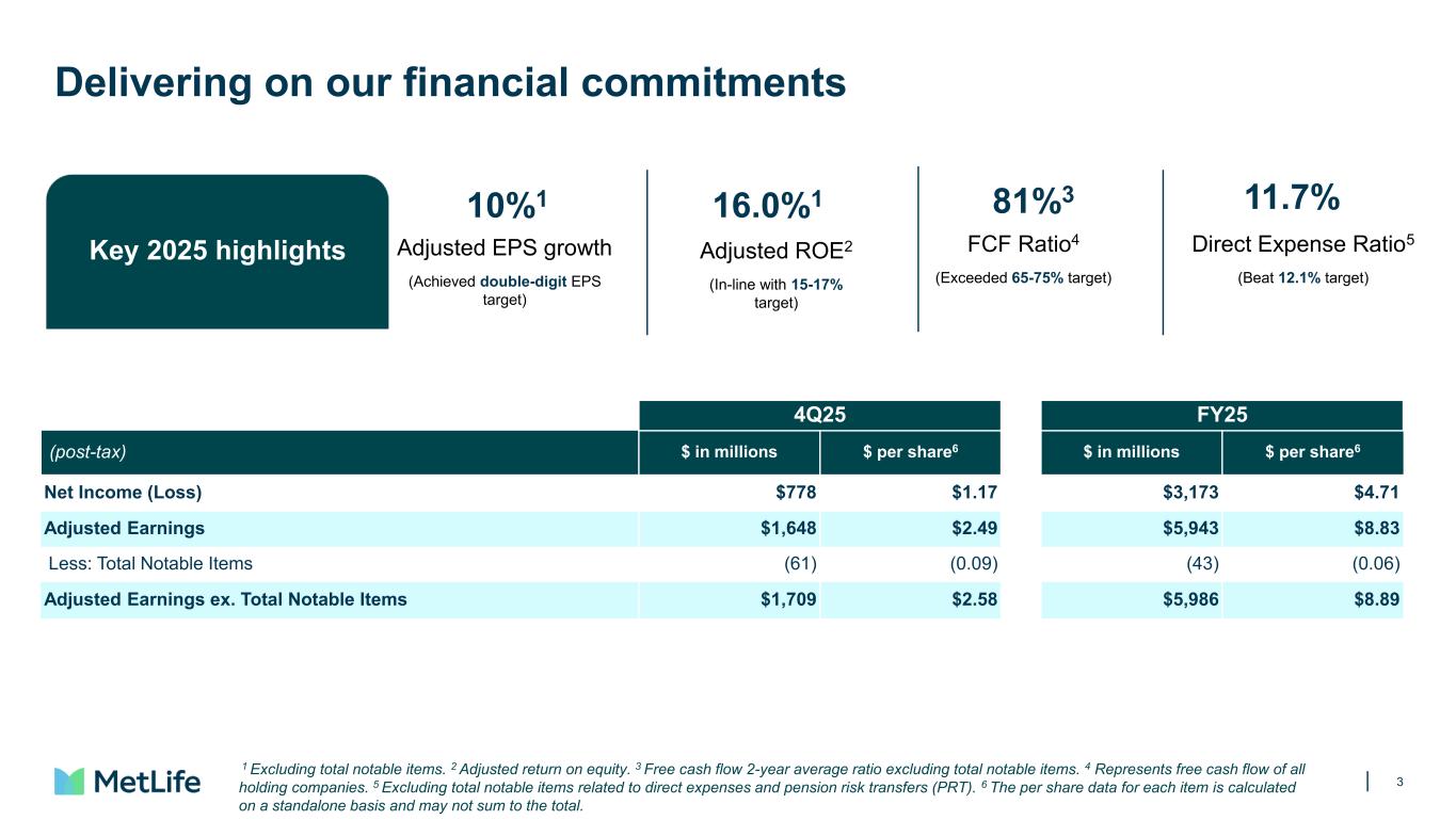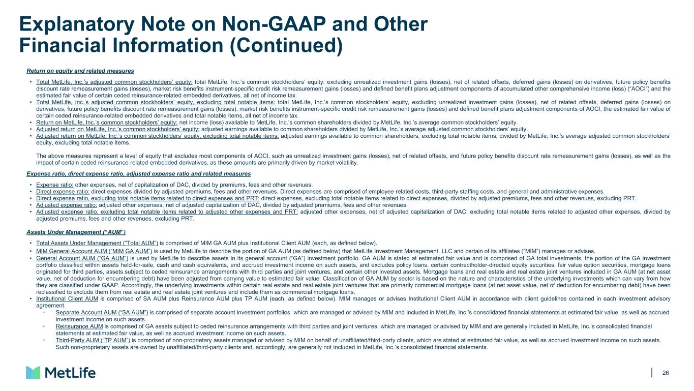 25 Explanatory Note on Non-GAAP and Other Financial Information (Continued) Asymmetrical and non-economic accounting adjustments are made in calculating adjusted earnings: • Universal life and investment-type product policy fees exclude asymmetrical accounting associated with in-force reinsurance. • Net investment income includes earned income on derivatives and amortization of premium on derivatives that are hedges of investments or that are used to replicate certain investments, but do not qualify for hedge accounting treatment (“Investment hedge adjustments”). • Other revenues include settlements of foreign currency earnings hedges and exclude asymmetrical accounting associated with in-force reinsurance. • Policyholder benefits and claims excludes (i) inflation-indexed benefit adjustments associated with contracts backed by inflation-indexed investments, (ii) asymmetrical accounting associated with in-force reinsurance, and (iii) non-economic losses incurred at contract inception for certain single premium annuity business. These losses are amortized into adjusted earnings within policyholder benefits and claims over the estimated lives of the contracts. • Policyholder liability remeasurement gains (losses) excludes asymmetrical accounting associated with in-force reinsurance. • Interest credited to policyholder account balances excludes amounts associated with periodic crediting rate adjustments based on the total return of a contractually referenced pool of assets and other pass-through adjustments and asymmetrical accounting associated with in-force reinsurance. “Divested businesses” are those that have been or will be sold or exited by MetLife but do not meet the discontinued operations criteria under GAAP. Divested businesses also include the net impact of transactions with exited businesses that have been eliminated in consolidation under GAAP and costs relating to businesses that have been or will be sold or exited by MetLife that do not meet the criteria to be included in results of discontinued operations under GAAP. Other adjustments are made in calculating adjusted earnings: • Beginning in the fourth quarter of 2025, net investment income excludes depreciation of wholly-owned real estate and real estate joint ventures. • Net investment income and interest credited to policyholder account balances exclude certain amounts related to contractholder-directed equity securities (“Unit-linked contract income” and “Unit-linked contract costs”). • Net investment income and other expenses exclude Reinsurance activity (as defined below). • Net investment income and interest expense on debt exclude amounts related to collateralized financing entities that are consolidated variable interest entities. • Other revenues include fee revenue on synthetic guaranteed interest contracts (“GICs”) accounted for as freestanding derivatives. • Other expenses exclude (i) amortization and impairment of asset management intangible assets, (ii) implementation of new insurance regulatory requirements and other costs, and (iii) acquisition, integration and other related costs. Other expenses include (i) deductions for net income attributable to noncontrolling interests and redeemable noncontrolling interests, and (ii) benefits accrued on synthetic GICs accounted for as freestanding derivatives. • “Reinsurance activity” relates to amounts subject to ceded reinsurance arrangements with third parties and joint ventures, including (i) the related investment returns and expenses which are passed through to the reinsurers and (ii) the corresponding invested assets and cash and cash equivalents. Adjusted earnings also excludes the recognition of certain contingent assets and liabilities that could not be recognized at acquisition or adjusted for during the measurement period under GAAP business combination accounting guidance. The tax impact of the adjustments mentioned above are calculated net of the U.S. or foreign statutory tax rate, which could differ from MetLife’s effective tax rate. Additionally, the provision for income tax (expense) benefit also includes the impact related to the timing of certain tax credits, as well as certain tax reforms. In addition, adjusted earnings available to common shareholders excludes the impact of preferred stock redemption premium, which is reported as a reduction to net income (loss) available to MetLife, Inc.’s common shareholders. Investment portfolio gains (losses) and derivative gains (losses) These are measures of investment and hedging activity. Investment portfolio gains (losses) principally excludes amounts that are reported within net investment gains (losses) but do not relate to the performance of the investment portfolio, such as gains (losses) on sales and divestitures of businesses, as well as investment portfolio gains (losses) of divested businesses. Derivative gains (losses) principally excludes earned income on derivatives and amortization of premium on derivatives, where such derivatives are either hedges of investments or are used to replicate certain investments, and where such derivatives do not qualify for hedge accounting. This earned income and amortization of premium is reported within adjusted earnings and not within derivative gains (losses).