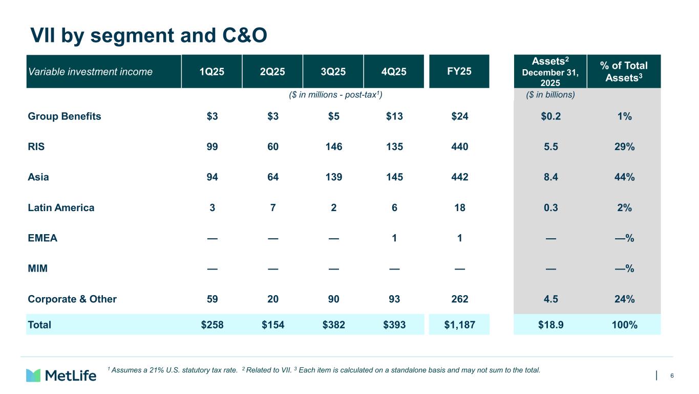 66 VII by segment and C&O Variable investment income 1Q25 2Q25 3Q25 4Q25 FY25 Assets2 December 31, 2025 % of Total Assets3 ($ in millions - post-tax1) ($ in billions) Group Benefits $3 $3 $5 $13 $24 $0.2 1% RIS 99 60 146 135 440 5.5 29% Asia 94 64 139 145 442 8.4 44% Latin America 3 7 2 6 18 0.3 2% EMEA — — — 1 1 — —% MIM — — — — — — —% Corporate & Other 59 20 90 93 262 4.5 24% Total $258 $154 $382 $393 $1,187 $18.9 100% 1 Assumes a 21% U.S. statutory tax rate. 2 Related to VII. 3 Each item is calculated on a standalone basis and may not sum to the total.